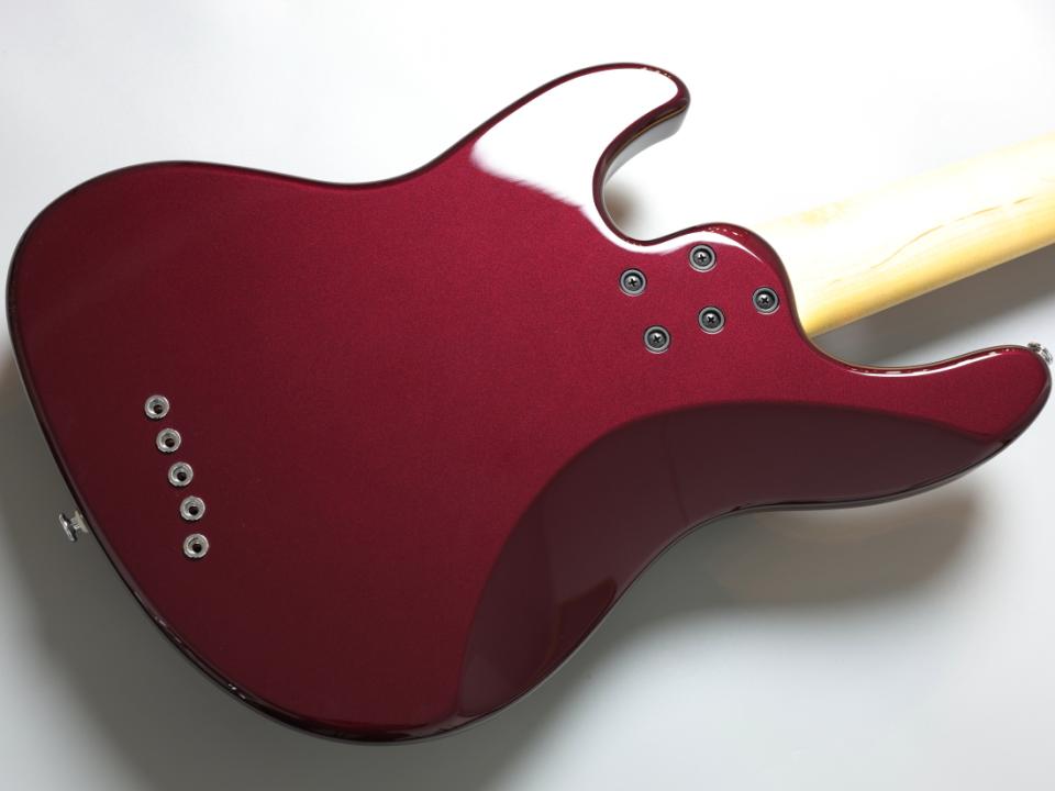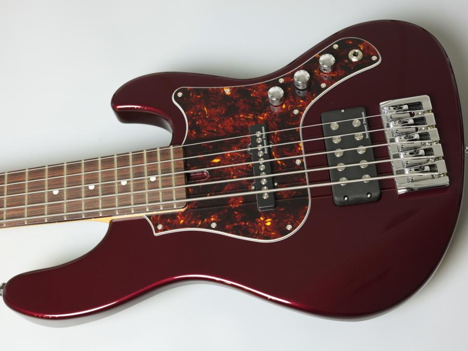 当モデルは、アルダーボディ、ローズウッド指板、あずきメタリックカラーという組み合わせの5弦ベース。「あずきメタリック」は当モデルのために新しく作られた色で、暗いところだと一瞬ブラックのようにも見えるシックな赤色ですが、光を当てるとさまざまな顔を見せてくれます。見れば見るほどに味わいの出るカラーです。鼈甲ピックガードとの組み合わせで、高級感もアップ。