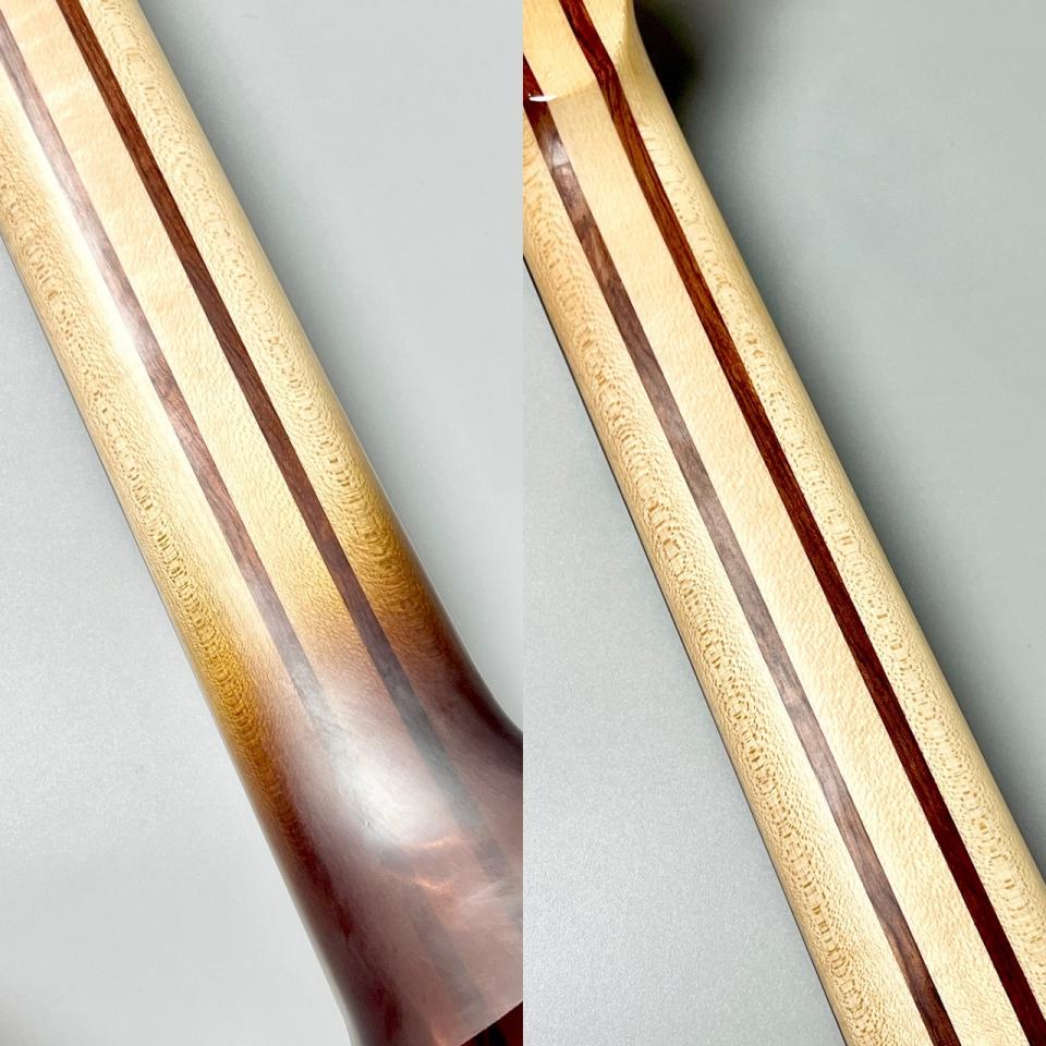 さらに、ネックとボディを一体化させたネックスルー構造を採用。これにより、ネックエンドからボディエンドまで振動がダイレクトに伝わり、驚異的なサスティンと豊かなレゾナンスを獲得しています。ハイポジションでの演奏性も格段に向上しており、24フレットすべてを余すことなく使い切れます。