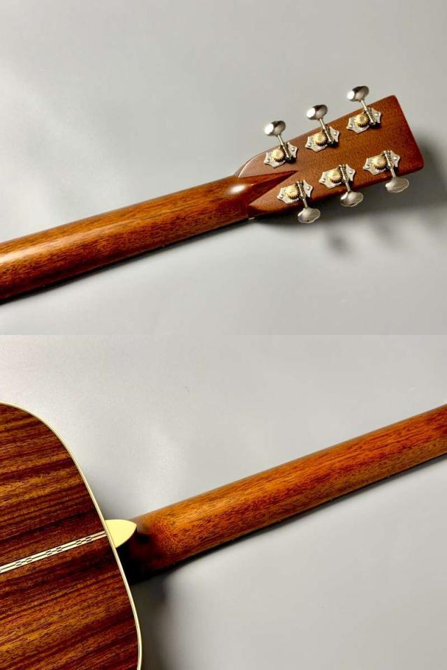 1902年に誕生した000-28は、Martinの歴史の中でも長きにわたり受け継がれてきたトリプルオーサイズの代表的モデルです。当時主流であったパーラーサイズより一回り大きいボディを持つ新しい試みとして登場し、後に14フレットジョイントへと進化しながらフィンガースタイルからストロークまで幅広い演奏スタイルに対応する万能機として確固たる地位を築きました。ドレッドノートよりもややコンパクトで抱えやすいボディと24.9インチのショートスケールにより、優れたレスポンスと歯切れの良いサウンドを実現。豊かな倍音を伴うローズウッドの低音と、繊細で伸びやかな高音がバランスよく響く、Martinを代表するサウンドキャラクターを体現しています。