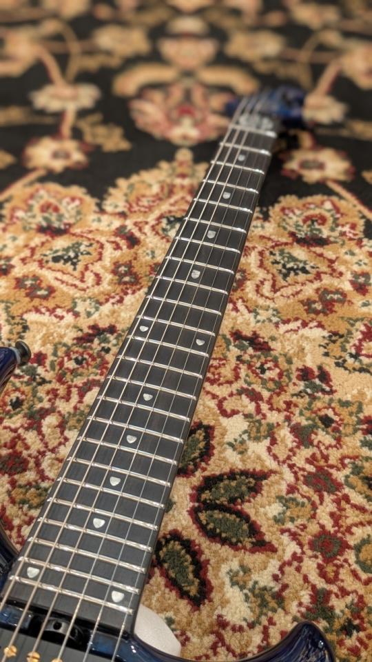 指板: 硬質な**エボニー(Ebony)指板に、Atlante Majesty Inlaysが輝き、速弾きからテクニカルなプレイまでを支える24本のステンレス・スチール・フレット(Medium Jumbo)**が打ち込まれています。