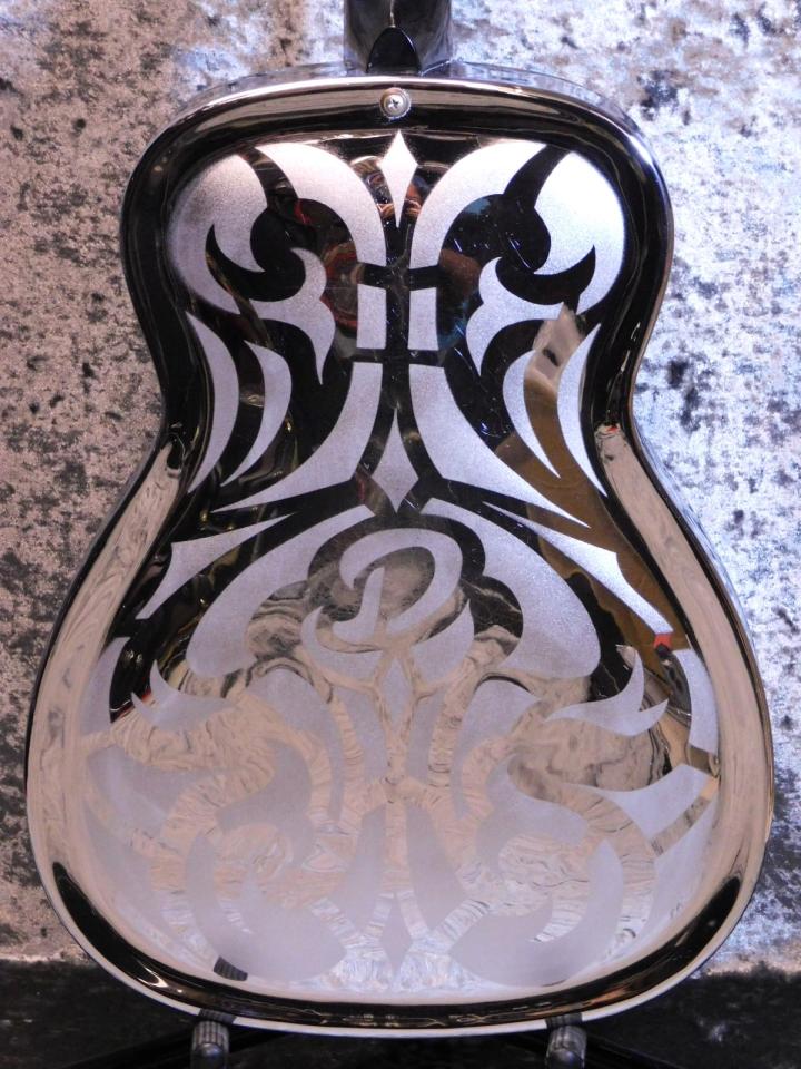 本器はハワイアン模様ではなく、植物の紋様ががサンドブラストで描かれ、ボディバックのD模様も印象的なモデル。