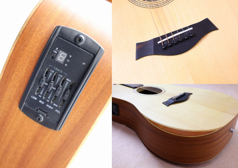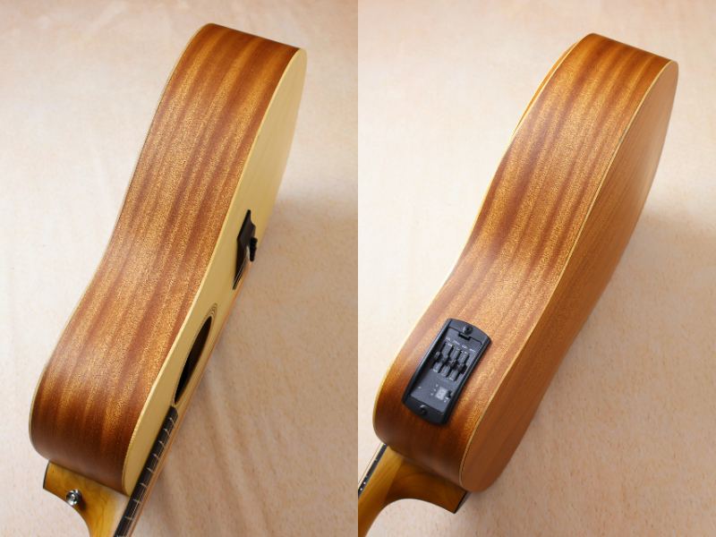 フルサイズに近いドレッドノート形状を採用し、豊かな音量と深みのある低音を実現。ストローク時には迫力のあるサウンドが広がり、弾き語りにも最適です。