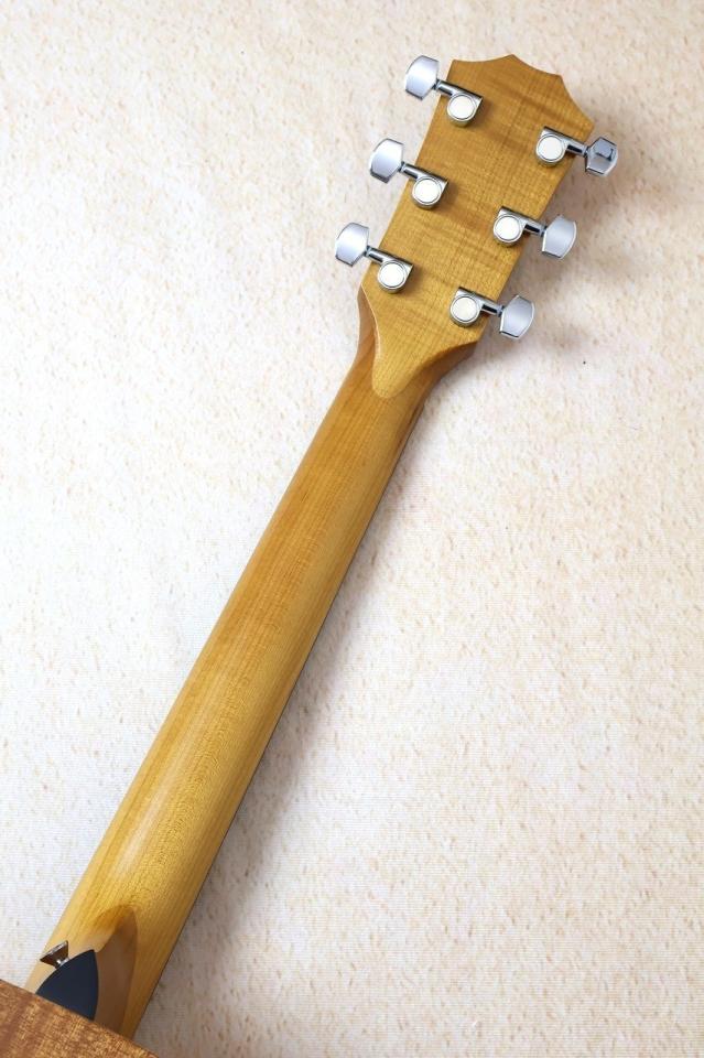 トップ材にはシトカ・スプルース単板を採用し、明瞭でバランスの取れたサウンドを実現。低音から高音まで素直に響き、コードストロークはもちろん、フィンガースタイルでも繊細な表現が可能です。Taylor独自の設計思想により、軽やかなタッチでもしっかりと鳴り、弾き手のニュアンスを忠実に反映します。