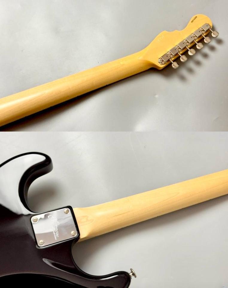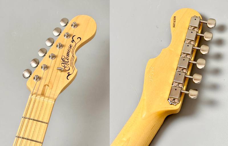 やや大きくえぐった1弦側ホーン、埋め込み式ネックセットプレート、大きく開いたロッドアジャスト用ホール、指板と同じ素材のバインディングなどトラディショナルなSTスタイルをmomose流にアレンジしたモデル。