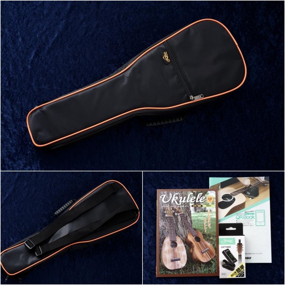 ・サービス品としてチューナー、ウクレレ教則本、チューニングや弦交換方法、管理方法を記載したガイドブックが付属します!