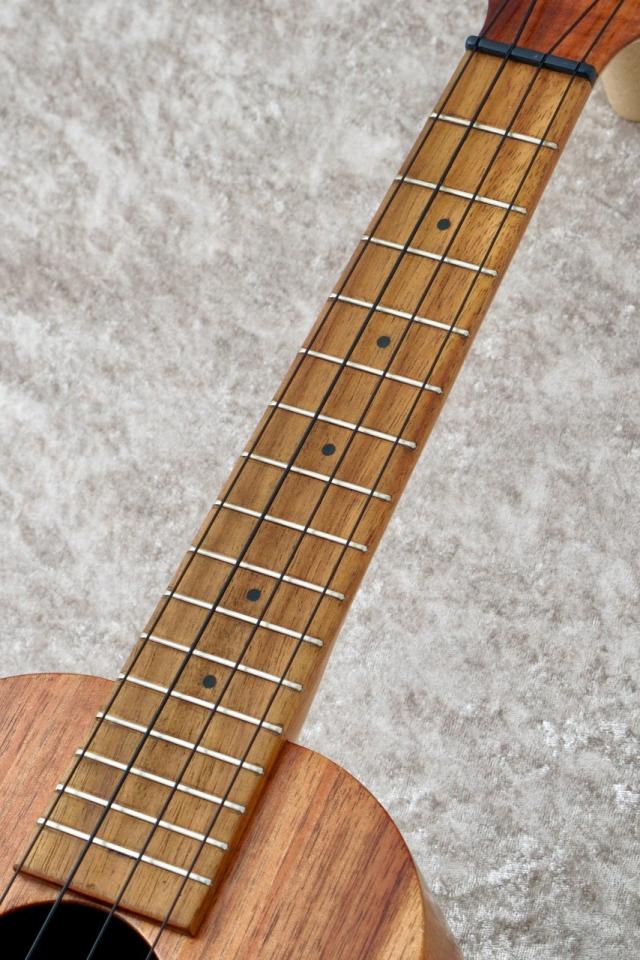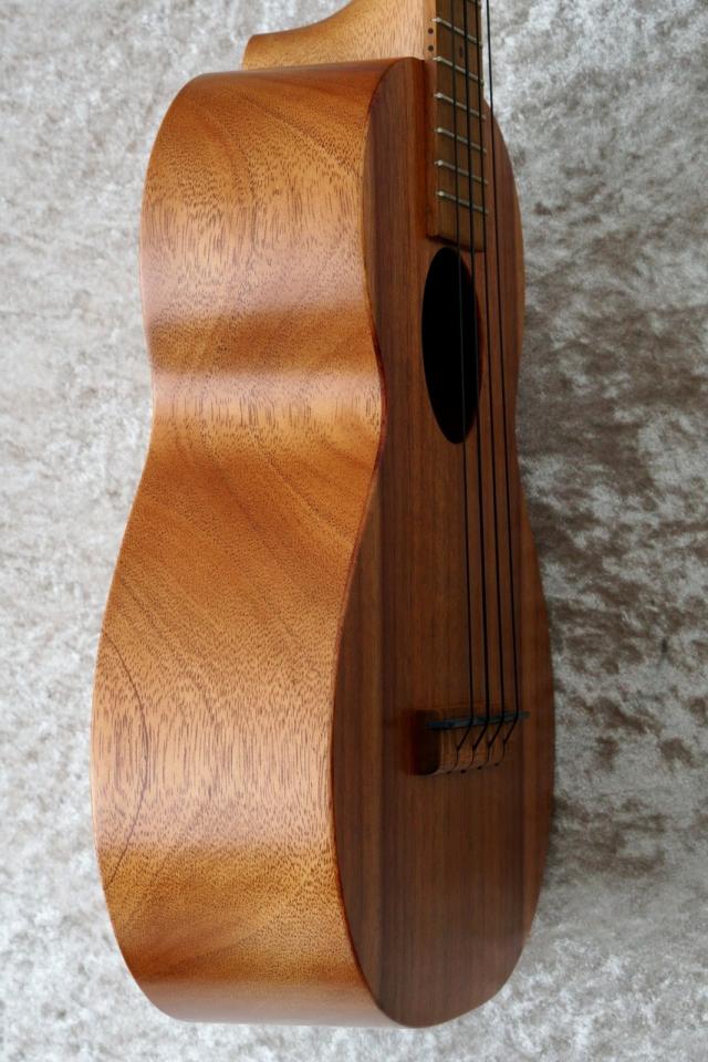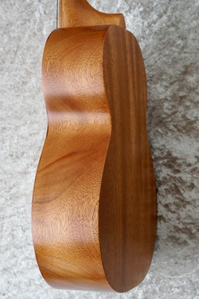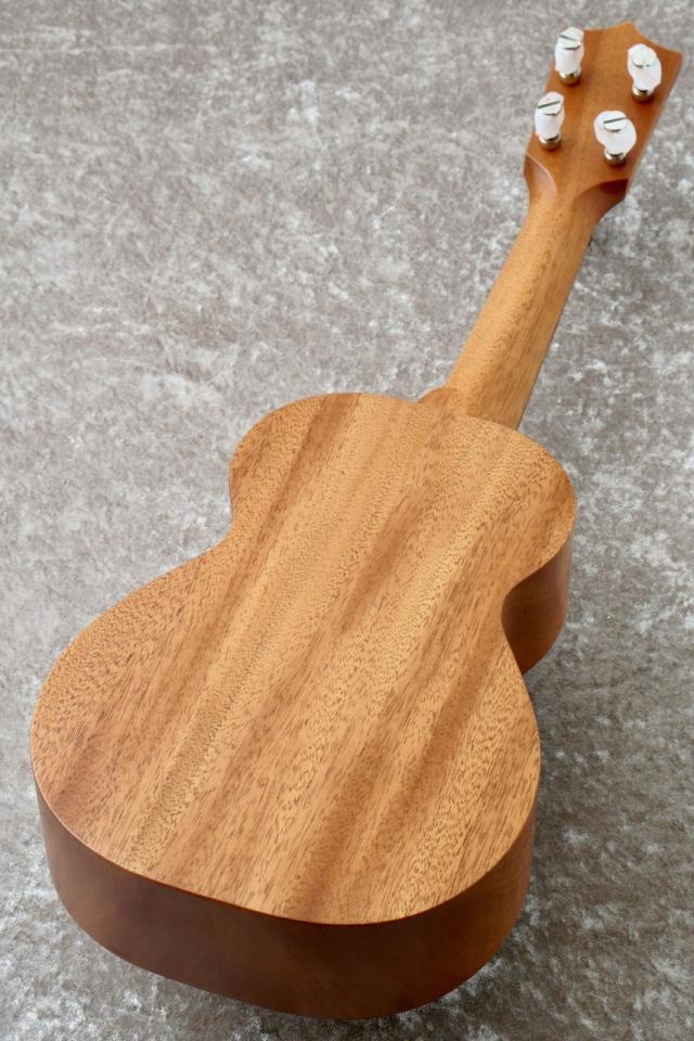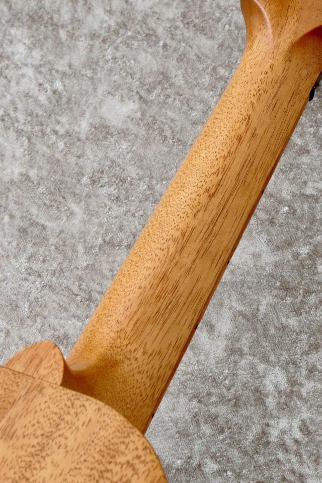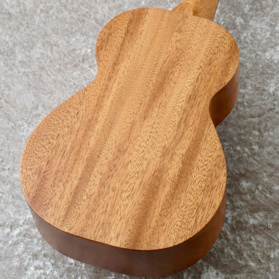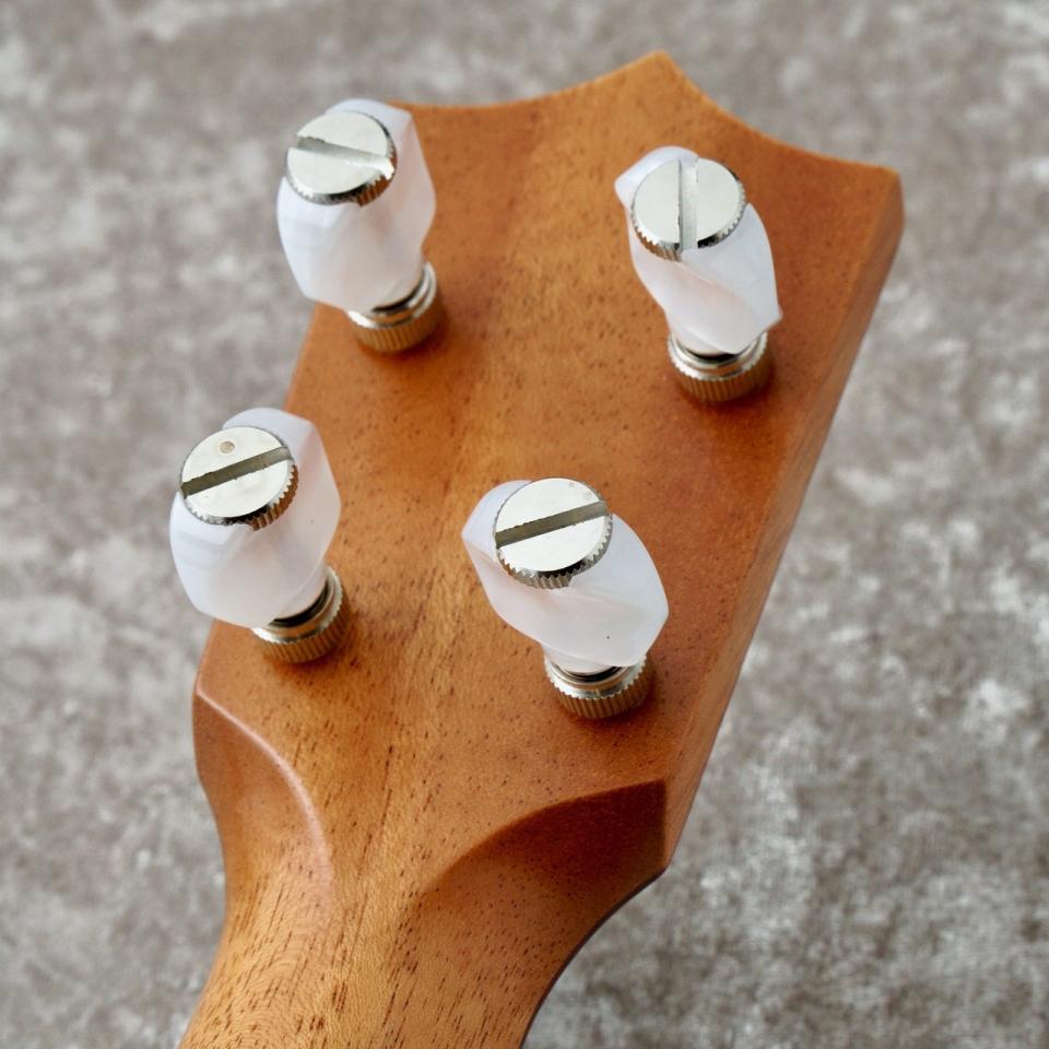 エボニー材のヘッドロゴが目を引くこのウクレレは、サイド&バックのマホガニー材は製材時に出た端材を使用、指板とブリッジのコア材に他のシリーズ製作時に発生した端材等が再加工ののちに使用されています。