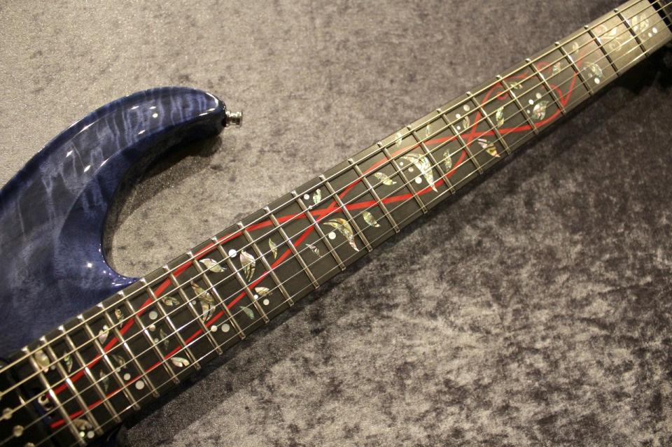 その上、彼が施すアーティスティックなフレットボードインレイやボディー/ネックのパーフリングは、ギター上に描かれた絵画というべき、美の極致に位置する作品です。