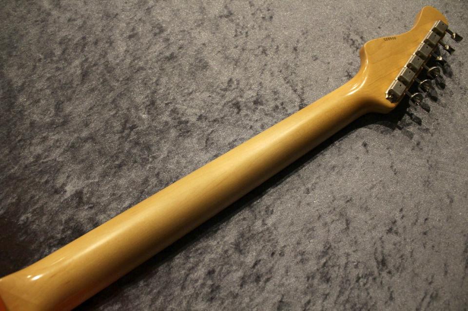 塗装に関しましては、ビンテージストラトサウンドを目指していた事もあり、オールラッカー塗装にて製作しております。ポリの場合は、音が安定するというメリットこそありますが、倍音感を抑え付けてしまう上に音が育たないというデメリットもある為、サウンドと将来の成長を取りラッカー塗装を採用致しました。