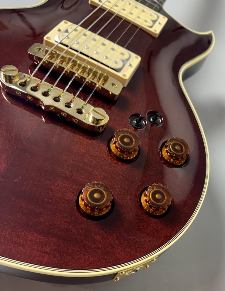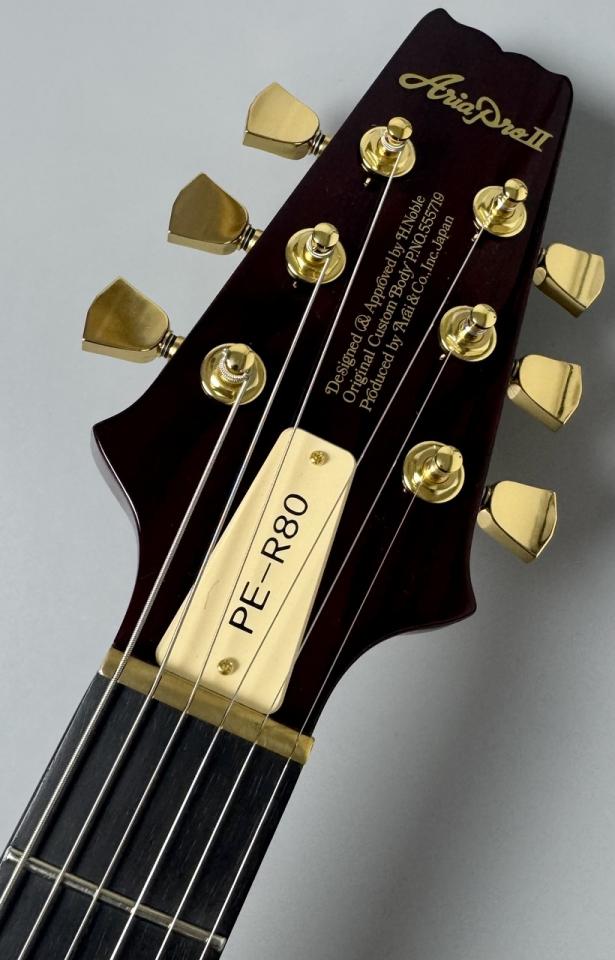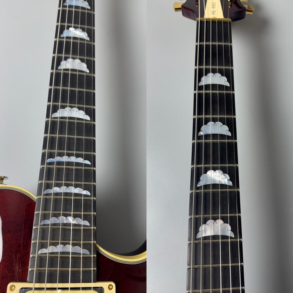 その系譜に位置するPE-R80は、シリーズの中でも実戦的な仕様を備えた上位グレードモデル。アーチ加工が施されたメイプルトップ/マホガニーバック構造により、芯のあるミッドレンジと伸びやかな高域を両立しています。クリーントーンでは艶やかに、ドライブ時には粘りと厚みを感じさせるサウンドが魅力です。