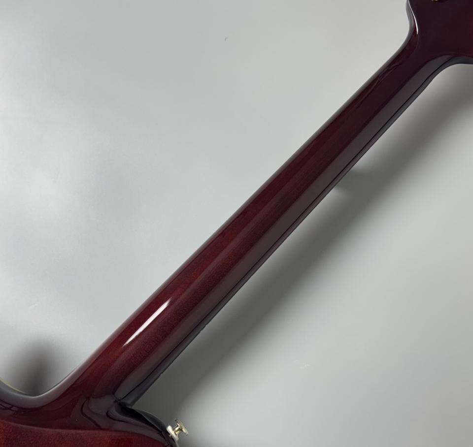 ブラスナット、GOTOH SG301ペグ、SPTブリッジ&QHテイルピースといった堅実なハードウェア構成も特筆すべきポイント。安定したチューニングとサスティーンを支えます。ゴールドパーツとStained Brownフィニッシュの組み合わせは、落ち着きと高級感を兼ね備えた佇まいです。