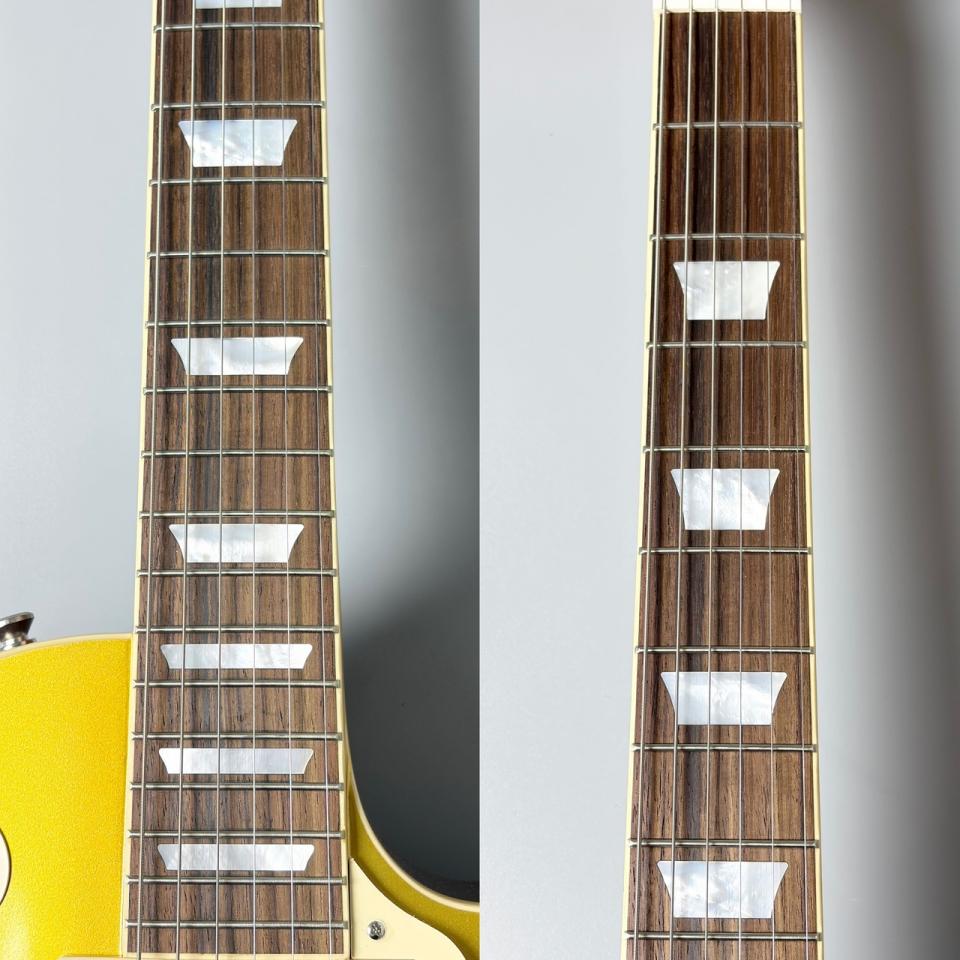 バインディングを施したローズウッド指板にはマザー・オブ・パールのトラペゾイド・インレイを備え、22本のミディアム・ジャンボ・フレットを搭載。ギブソンと同様のオープンブック型ヘッドストックには、エイジド加工を施したマザー・オブ・パールのEpiphoneロゴと、シルクスクリーン印刷されたゴールド色の「Les Paul Model」の文字が入ります。