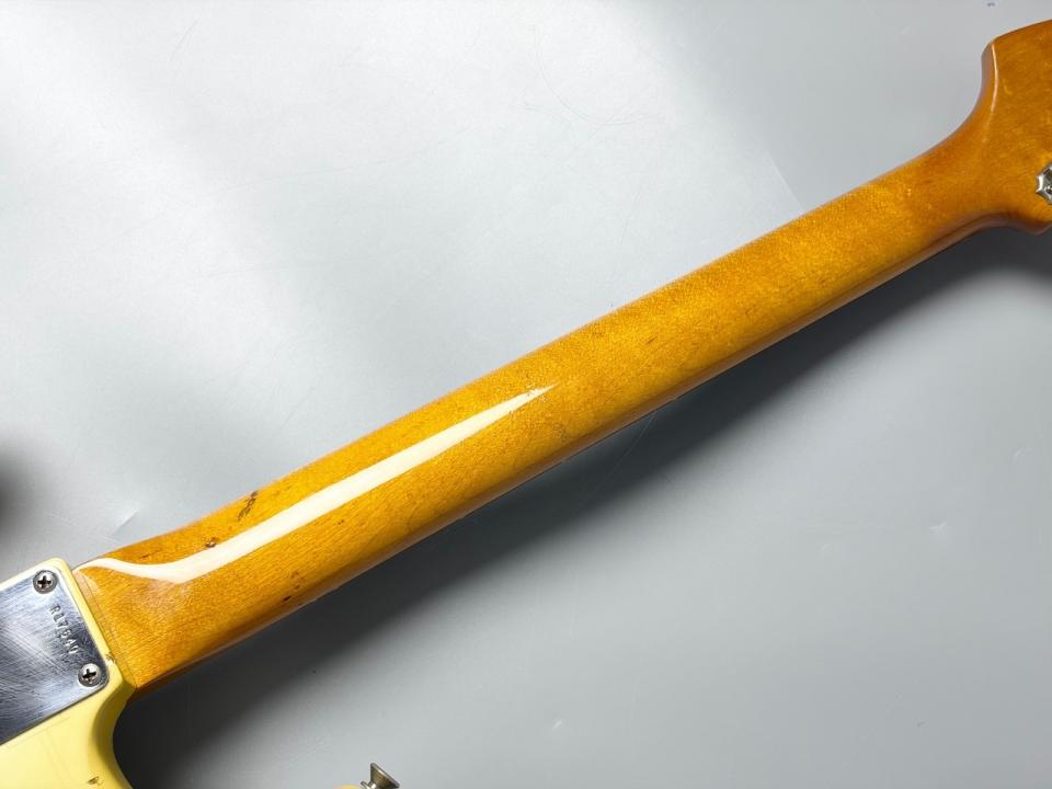 かなり色が濃く、目も詰まったローズウッド指板がヴィンテージイエローカラーのボディと相まって非常に美しく映えております。