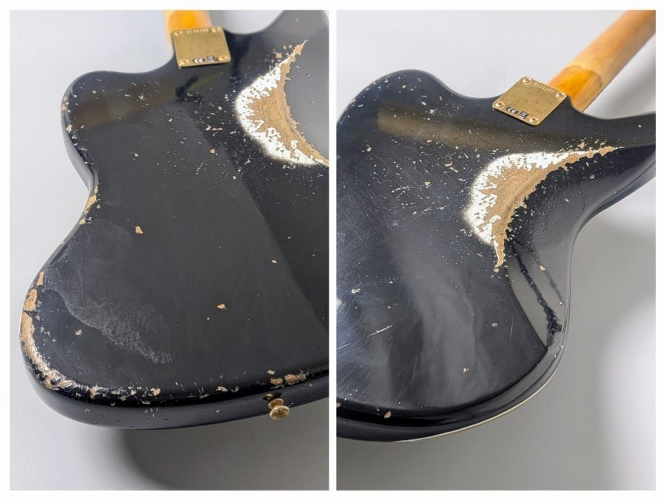 目を引くのは、Olympic Whiteの上にBlackを重ね、激しい演奏による塗装剥がれを再現したマルチレイヤー・フィニッシュ 。