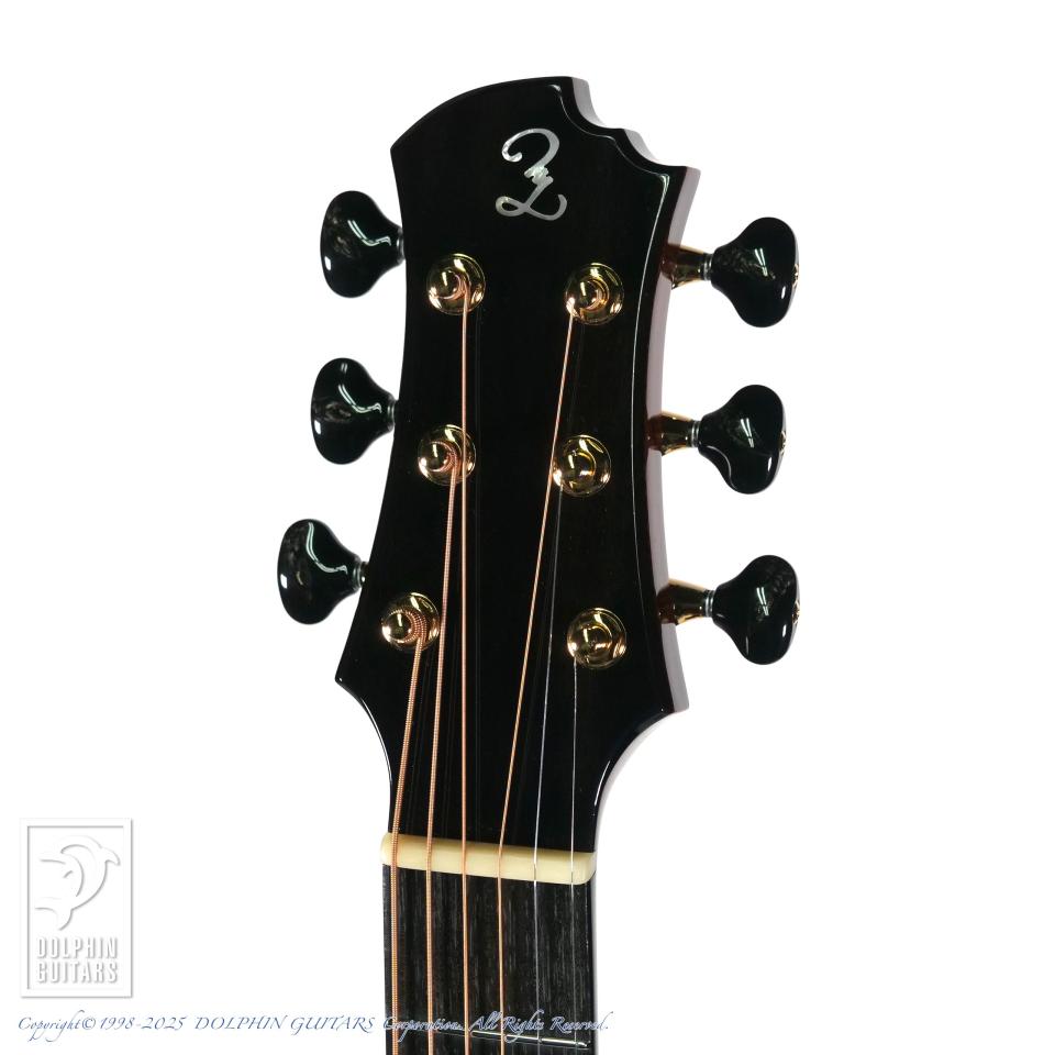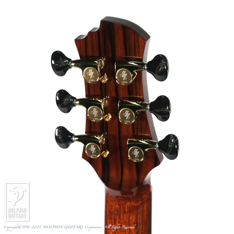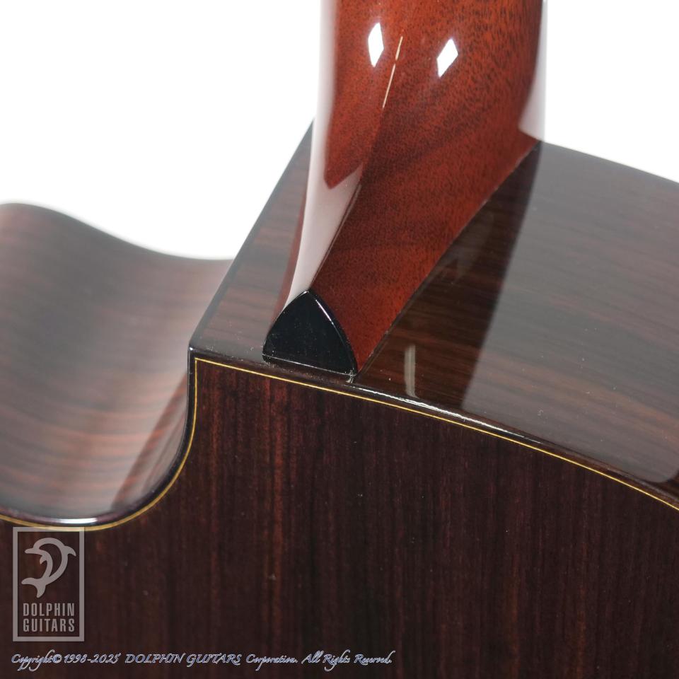 15周年という節目に特別なギターが欲しいという想いをカタチにしていただきました。使用材はインディアン・ローズウッド+ルッツ・スプルースとオーンドックスながらも、バック&サイドはできる限り薄いブラウン系でとこだわった選定をさせていただきました。ボディー・シェイプは前シグネチャーと同様ながら、ヘッド、ブリッジ形状は僕自身がデザインしたオリジナル・シェイプに変更してもらい、より特別なギターになりました。もちろんロゼッタやバインディングなど細かな装飾も全て僕が決めた特別仕様のシグネチャーモデルです。