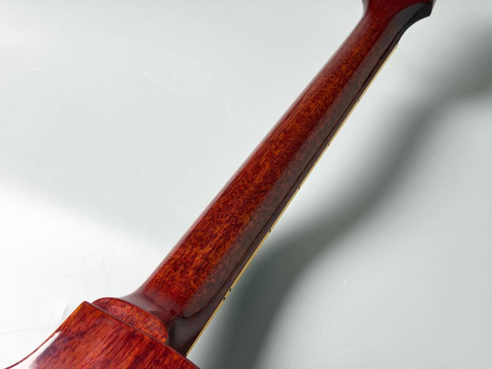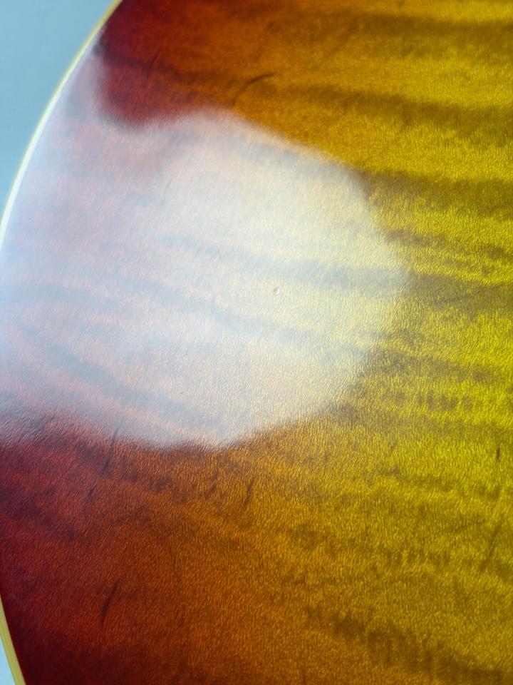 非常に鮮やか且つ色気のある深い色合いですが、カラーの美しさ以上に激しく主張するトップのフレイムメイプルの美しさは特に優れた個体であると感じられます。