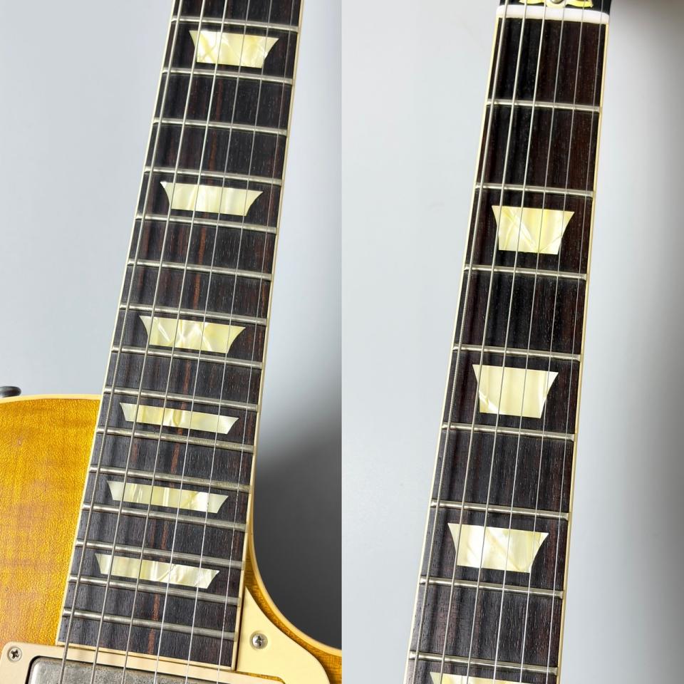 基本スペックは'59レスポールの60周年記念モデルを継承しており、グラマラスなトップ・カーブのアーチ形状や、ヴィンテージ同様の緩やかなポット・カーブ、LUXE社のオイル・ペーパーコンデンサー(Bumble Bee)の採用、ディッシュ・インレイの素材がより深みのあるヴィンテージに近い色味に、ヘッドのブランド・ロゴはよりヴィンテージに近いフォントへ、シルクスクリーンもフォント、位置、色味が変更されるなど、様々なアップデートが行われております。