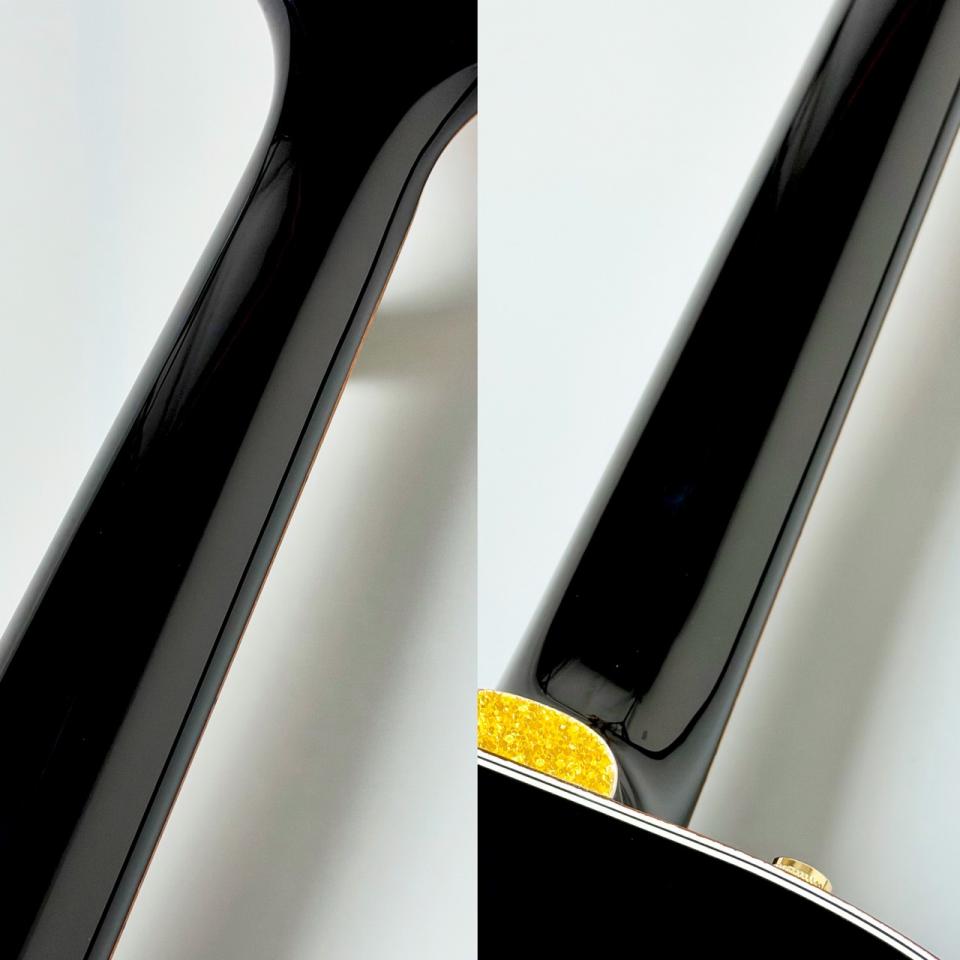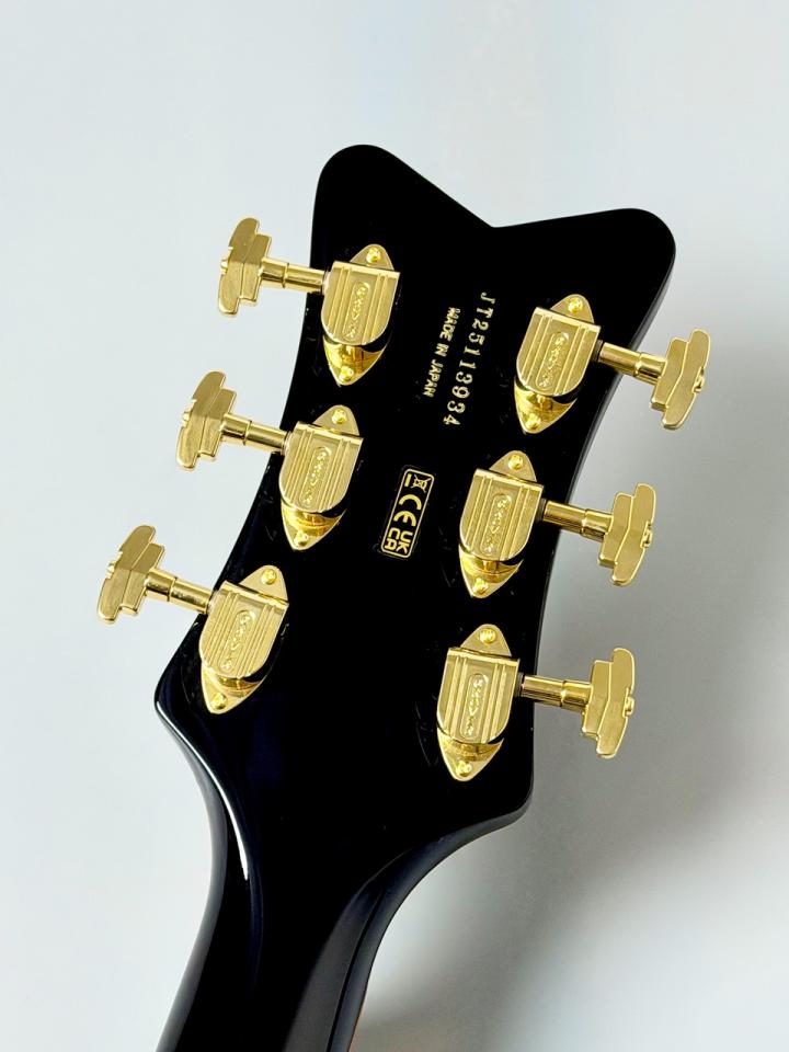 本モデルには、ゴールドのジュエルドGアローコントロールノブを採用しています。ボディ、ネック、Fホールにゴールドのスパークルバインディングを施している他、ゴールドハードウェアを装備しています。ボディはグロスニトロセルロースラッカーフィニッシュで、グレッチロゴが入った厚いヴィンテージゴールドプレキシピックガードも特徴です。