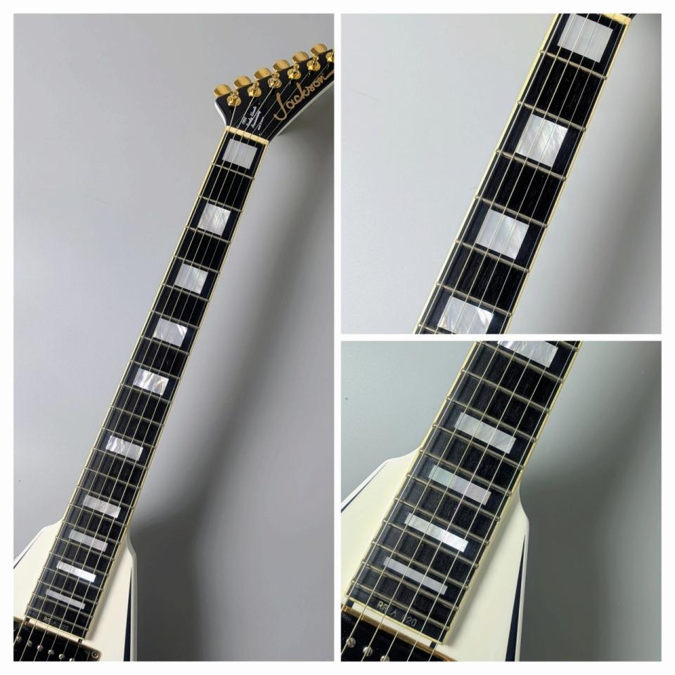 コンコルド・ヘッド&Vシェイプ: Jacksonの代名詞とも言える鋭いヘッドストックと、左右非対称のオフセットVボディ。ステージでの圧倒的な存在感を放ちます。