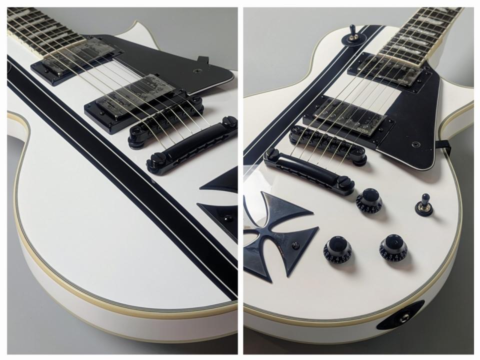 スノーホワイトのボディに映えるブラックのレーシングストライプ、そして12フレットのアイアン・クロス・インレイ。ジェイムズ本人が愛用する伝説的な個体の仕様を忠実に再現した、ファン垂涎のハイパフォーマンス・モデルです。