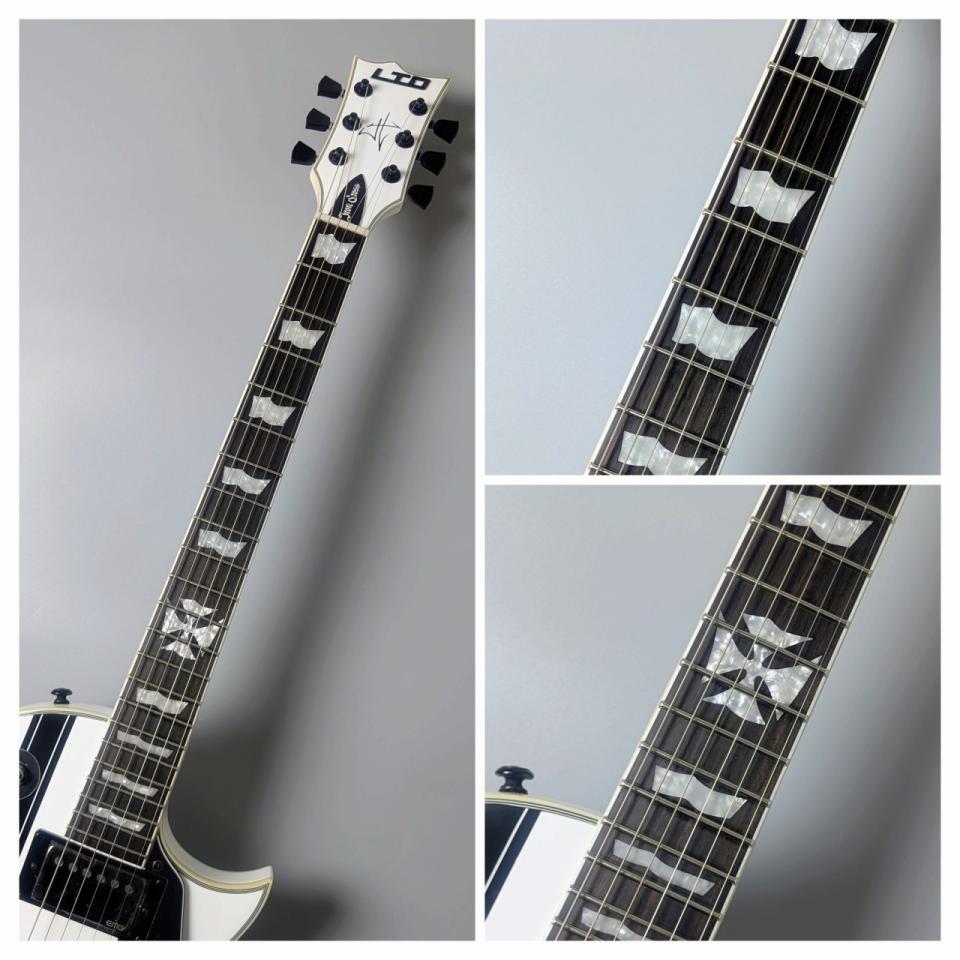 Ebony Fingerboard & Thin U Grip: 指板には漆黒のエボニーを採用し、立ち上がりの早いアタックをサポート。LTD伝統の「Thin U」シェイプにより、ヘヴィなローコード・リフから高速のシュレッドプレイまで、ストレスのない握り心地を提供します。