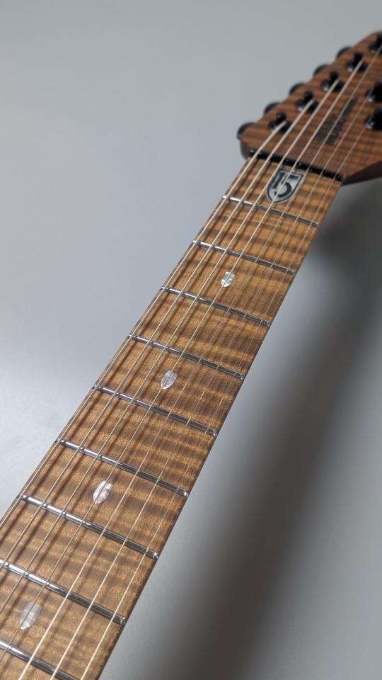 この7弦モデルは、まずその軽量なボディ構造に驚かされます。ボディには、レスポンスに優れ、豊かなミッドレンジを持つ**オクメ材**を採用。そしてトップには、杢目の美しさを極限まで引き立てる**フィギュアード・ローステッド・メイプル**を贅沢に使用しています。