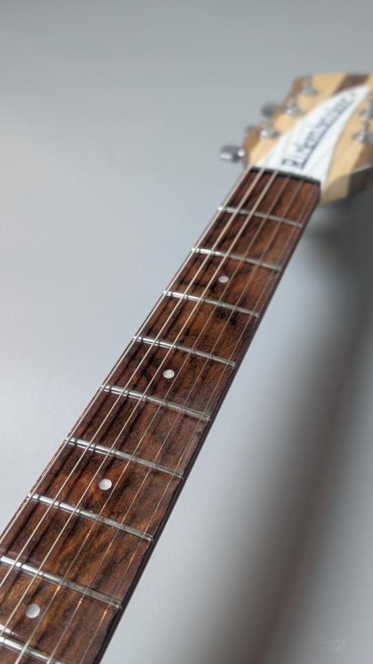 「R」テールピース: Rickenbackerの象徴とも言える**「R」テールピース**と、6サドルブリッジを装備。チューニングの安定性と美しいルックスを両立しています。
