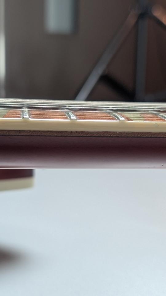 フレットの状態につきましては、ご留意いただきたい点がございます。 リッケンバッカーは元々背の低いフレットが打たれているのが特徴ですが、本個体は現状、さらに高さが低くなっている印象を受けます。正確な履歴は不明ですが、フレットの形状や残量から判断するに、おそらく過去にすり合わせ調整が施されたものと推測されます。