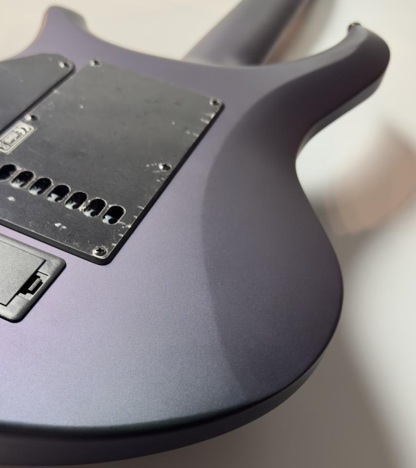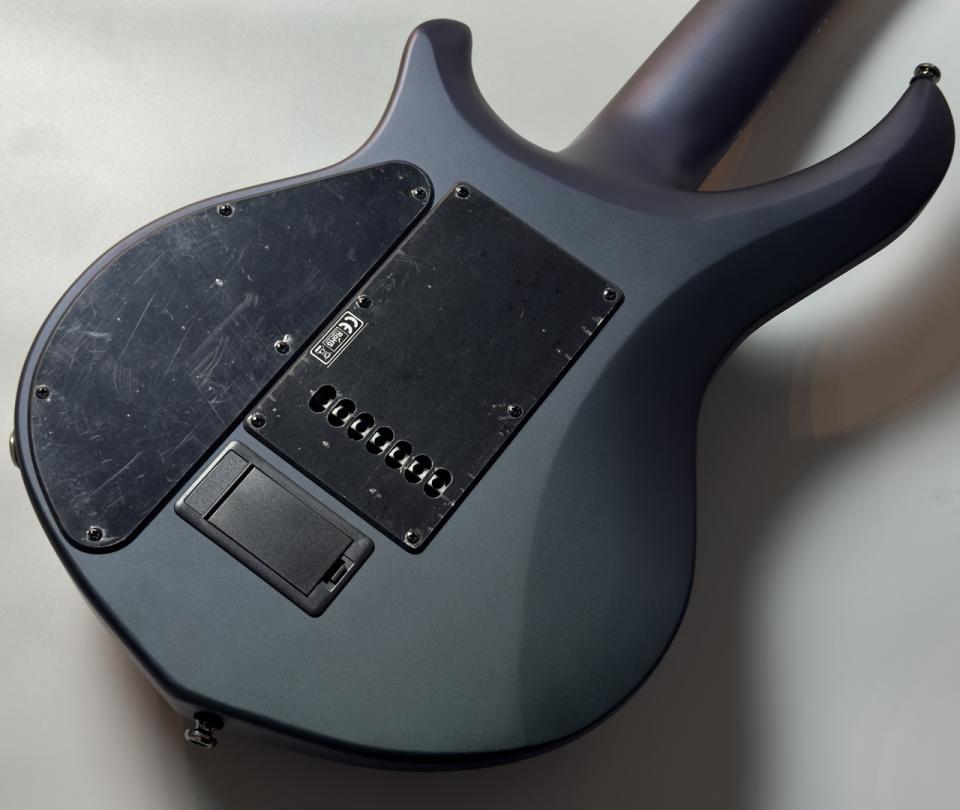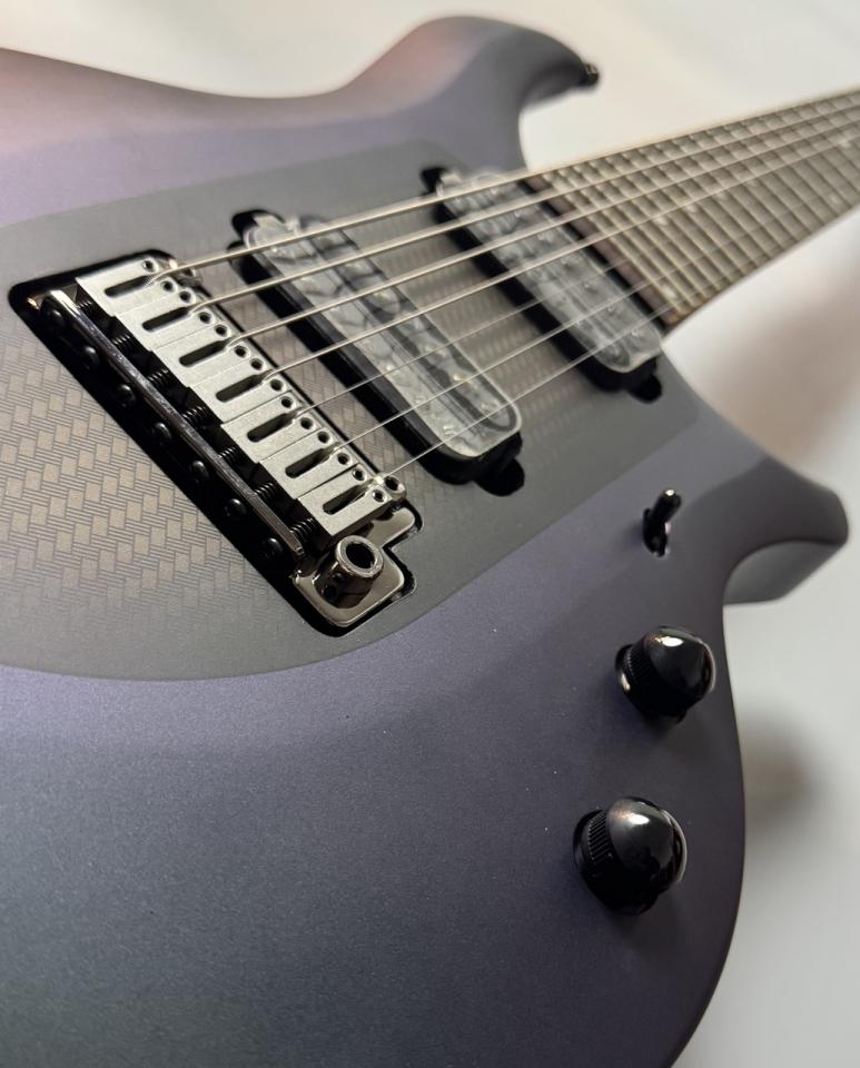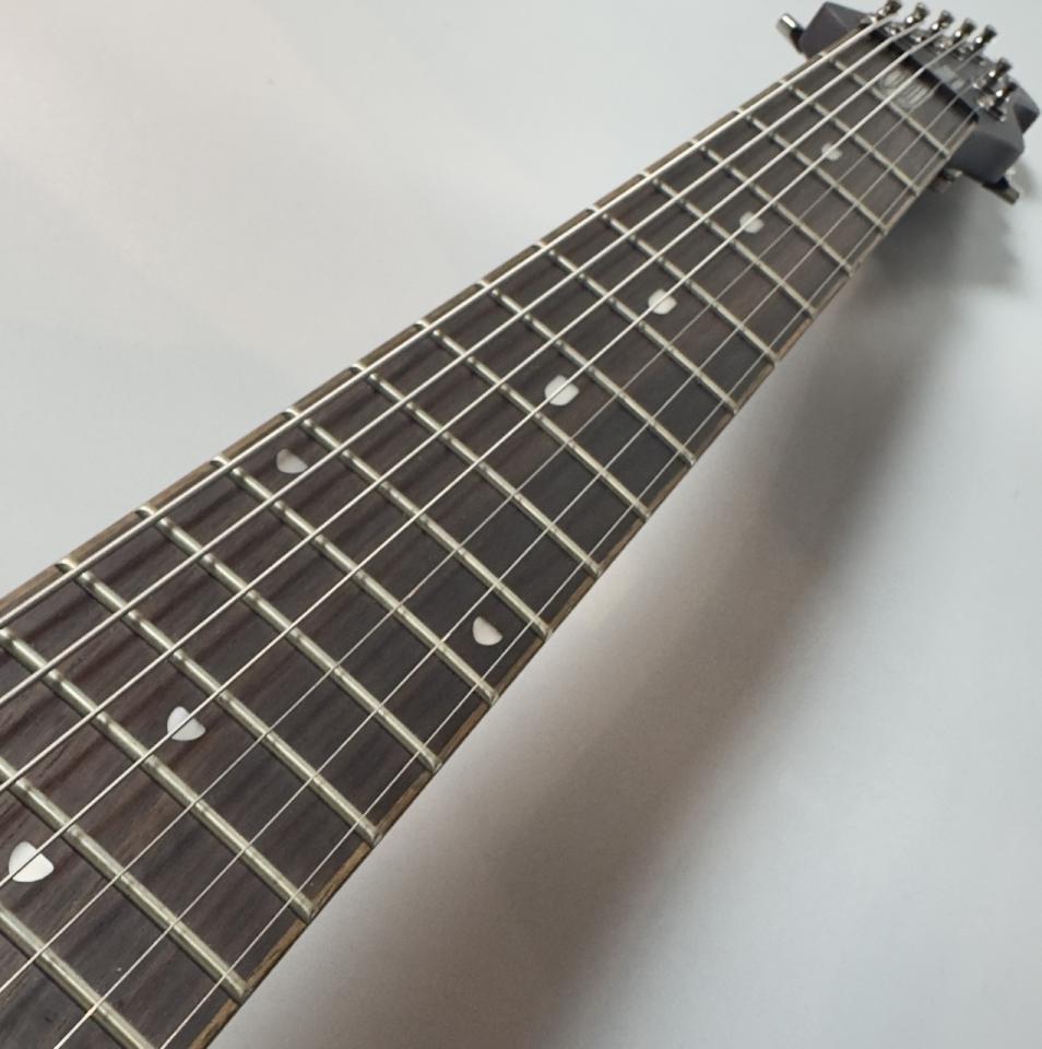 こちらは7弦仕様となります。7弦ローBも明快なサウンド、ネックの幅・太さ共に丁度良く難解なフレーズも弾きやすいプレイアビリティを確保しています。