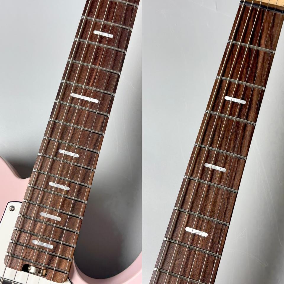 アタックが明瞭で突き抜けるような明るいサウンドを持つメイプル指板モデルと比べて、ローズウッド指板を採用したこちらのモデルは、柔らかなアタックと深みのあるローエンド、艶やかなミッドレンジの太さを感じるサウンドでギターボーカルにもぴったり合いそうなサウンドです。