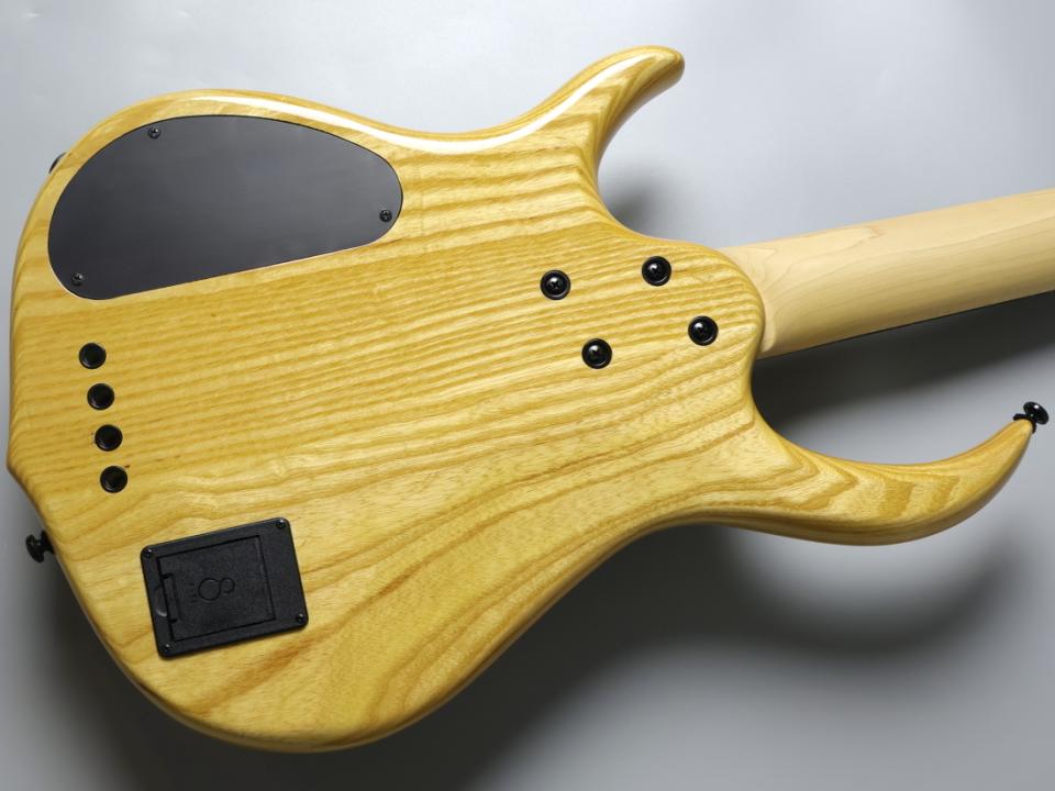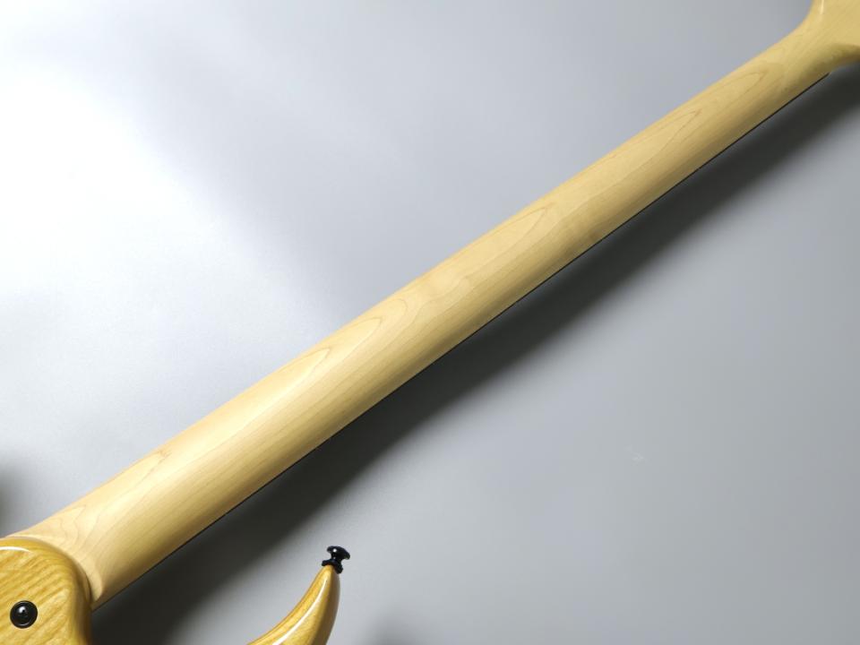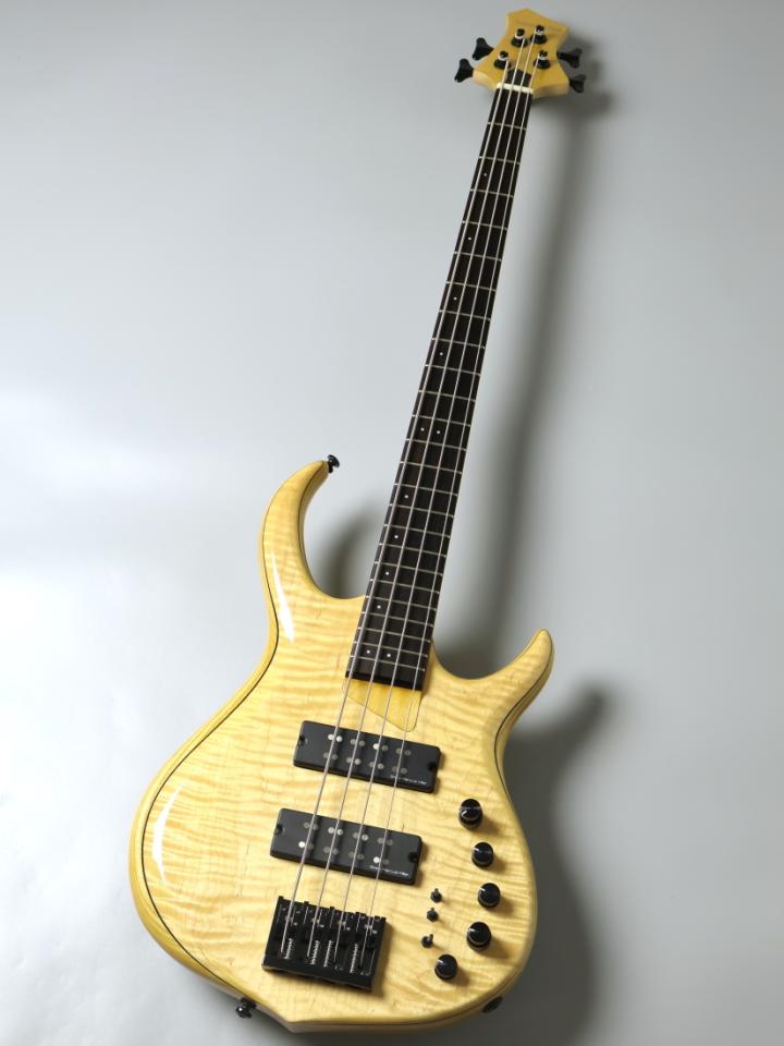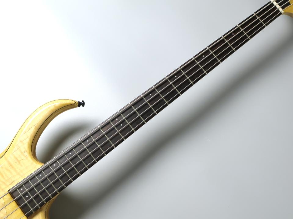 今回紹介の1本はオリジナルシェイプを用い、フレイムメイプルトップにアッシュ材をボディバックに使用したモデル。メイプルネック、24フレットのエボニー指板のネックのボルトオン構造。指板サイドは角を落としたロールド・エッジ加工を施しておりスムーズな演奏性が特徴になります。ナット幅を38mmのジャズベースと同様とすることで演奏性の両立を図っています。