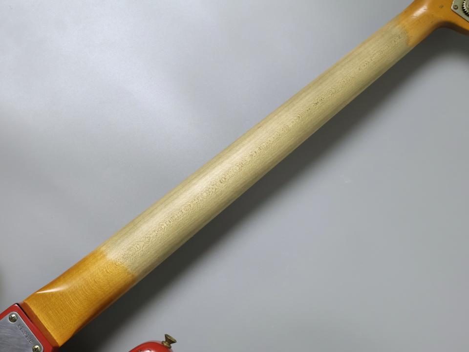 ヘッドトップからネック裏にかけてのダークティントに、経年変化で深みの増したフィエスタ・レッドのカラーリングの下には、当時のレギュラーカラーであるサンバーストを伺うことのできるマルチレイヤー仕様のルックスが格好良い1本。ヘヴィ・エイジドの仕上げに合わせたピックガードの湾曲も見事で、リアリティのあるルックスです。