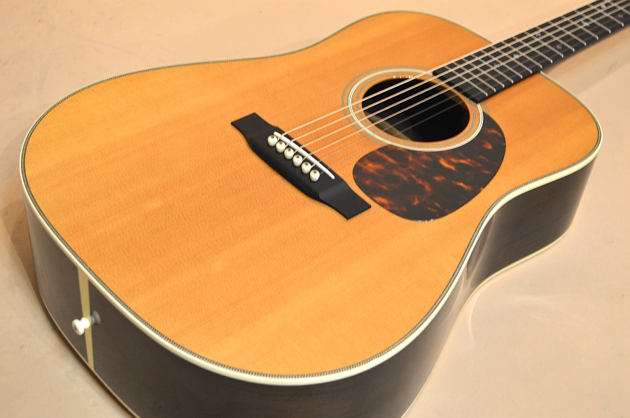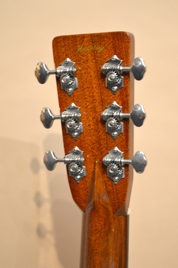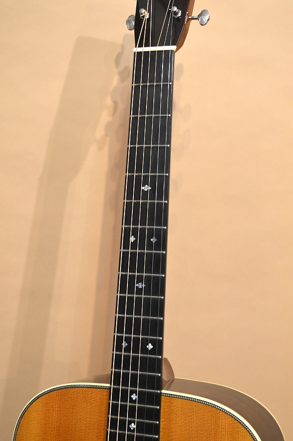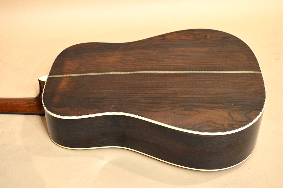 ソリッド・シトカ・スプルースTOP、ソリッド・ハカランダSIDE&BACK、アフリカン・マホガニー1ピースNECK、エボニー指板&ブリッジ、フォワード・シフト・スキャロップ・ブレーシング、実測45.2mmナット、645mmスケールのドレッドノート・ボディー。SIDE&BACKには三木楽器さん持ち込みの稀少なハカランダ材が使われ、ヘッド・プレートも持ち込みのハカランダ材が使用されています。ネックは実測で45.2mm幅あり、握った感じはしっかりとした握り心地のやや太めのソフトVシェイプ。このモデル、トップ材違いで3種類作られたようで、シトカ・トップが4本、イングルマン・スプルース3本、ヨーロピアン・スプルースが3本製作されたようです。SIDE&BACKのハカランダ材は三木さん持ち込みだけあって、両サイドにいくらか板目があるものの、ほとんどが柾目の良材が使用されています!