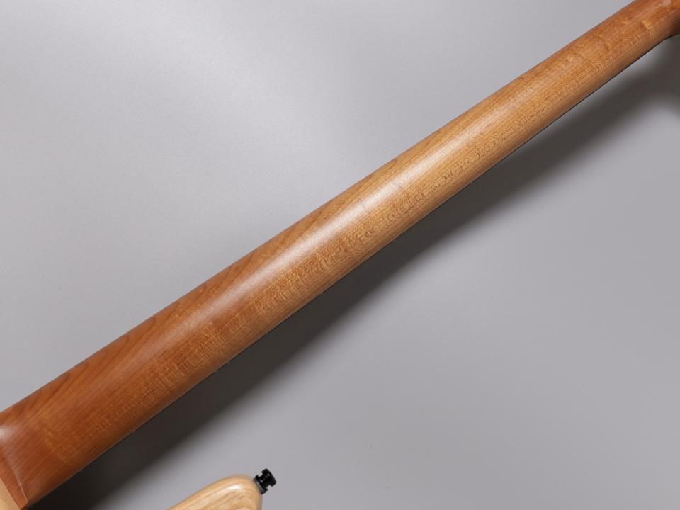 ボディバックには軽量かつバランス良く鳴ってくれるスワンプアッシュと、ボディトップには希少なAAAコアトップ、ネックには、ローステッドを施したメイプルネック、指板はタイガーストライプエボニーの組み合わせになります。