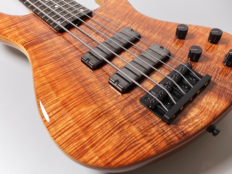木材構成を見ると大変硬質なトーンを想像しましたが軽量、チェンバー構造の恩赦があり、硬すぎずしっかりと奥行きのあるトーンです。硬質な木材が使用されているモデルはしっかりとしたピッキングタッチが求められる物が多いかと思いますがこちらのモデルは軽いタッチでもしっかりと木鳴りして、ネックの振動が感じられます。EQフラットの状態でも艶やかな素晴らしいトーンですがEQ、トーンコントロールを使用する事で大変幅広いサウンドメイクを可能にしています。