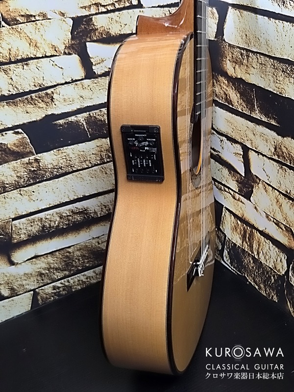 ピックアップに、Fishman PREFIX Pro Blend が搭載されており、ブリッチのサドル下に内蔵されたピエゾ素子と、横板プリアンプ裏側に内蔵のマイクの音を混ぜ合わせて出力が可能で、ステージ上でアンプを通した大音量でのパフォーマンスいただけます。