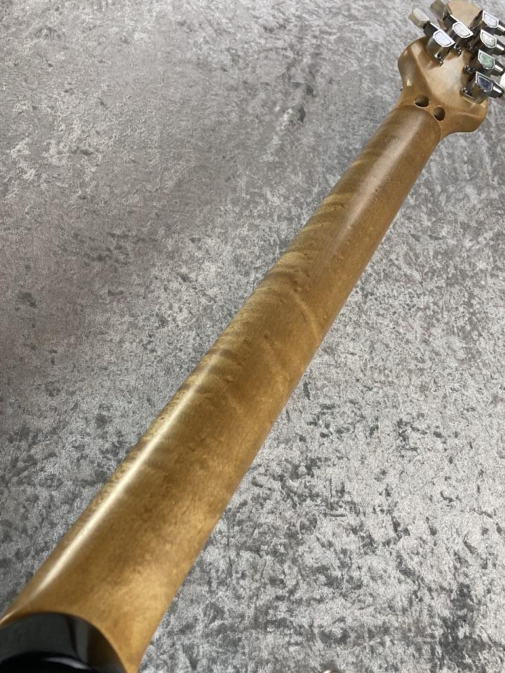 杢目の美しいメイプルトップにバスウッドバック、バーズアイメイプルネックといった基本スペックは、後継機種であるAXISへと受け継がれた伝統的な仕様。EVHモデル特有のヘッドのシグネチャーサイン(プリント)、独特のピックアップセレクター位置、ボディバックコンターを持たない点なども本モデルならではの特徴です。