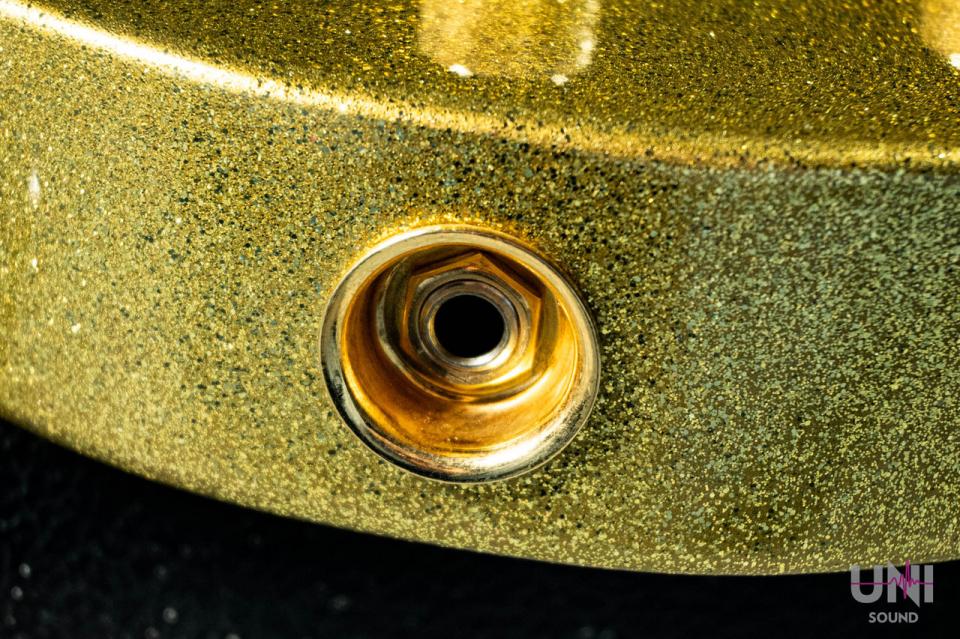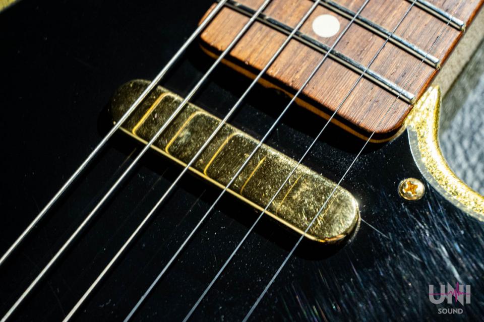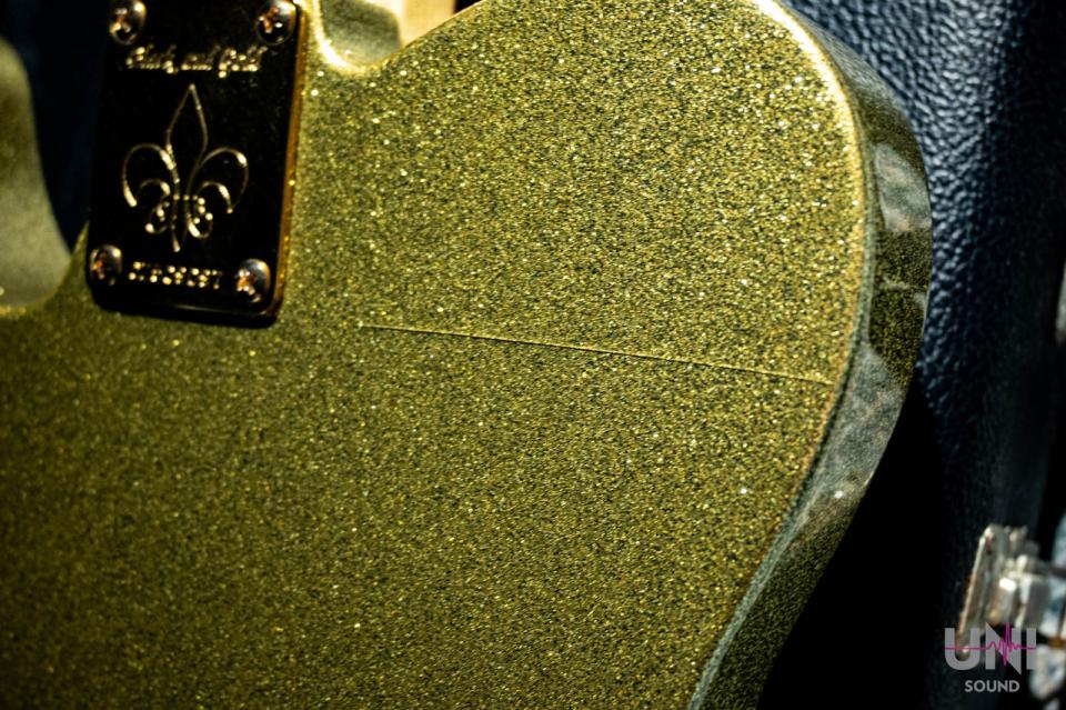 どう見ても通常仕様ではありません。ゴールド・スパークルのボディにゴールドパーツ、そこへブラックピックガードの組み合わせ。ネックプレートにはしっかり“Black and Gold”の刻印入り。かなり攻めた配色ですが、不思議とまとまりがあります。