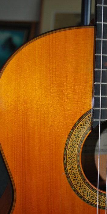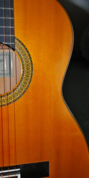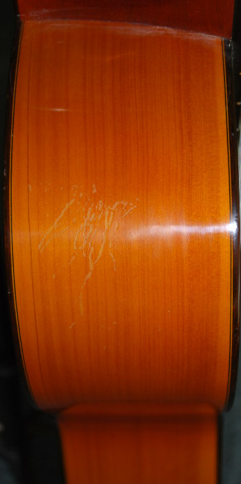 またフラメンコギターのユーズドではよく見られるゴルペ板からはみ出した弾き傷もあるが、いずれも塗装面だけの浅い傷で通常ではあまり目立たない。