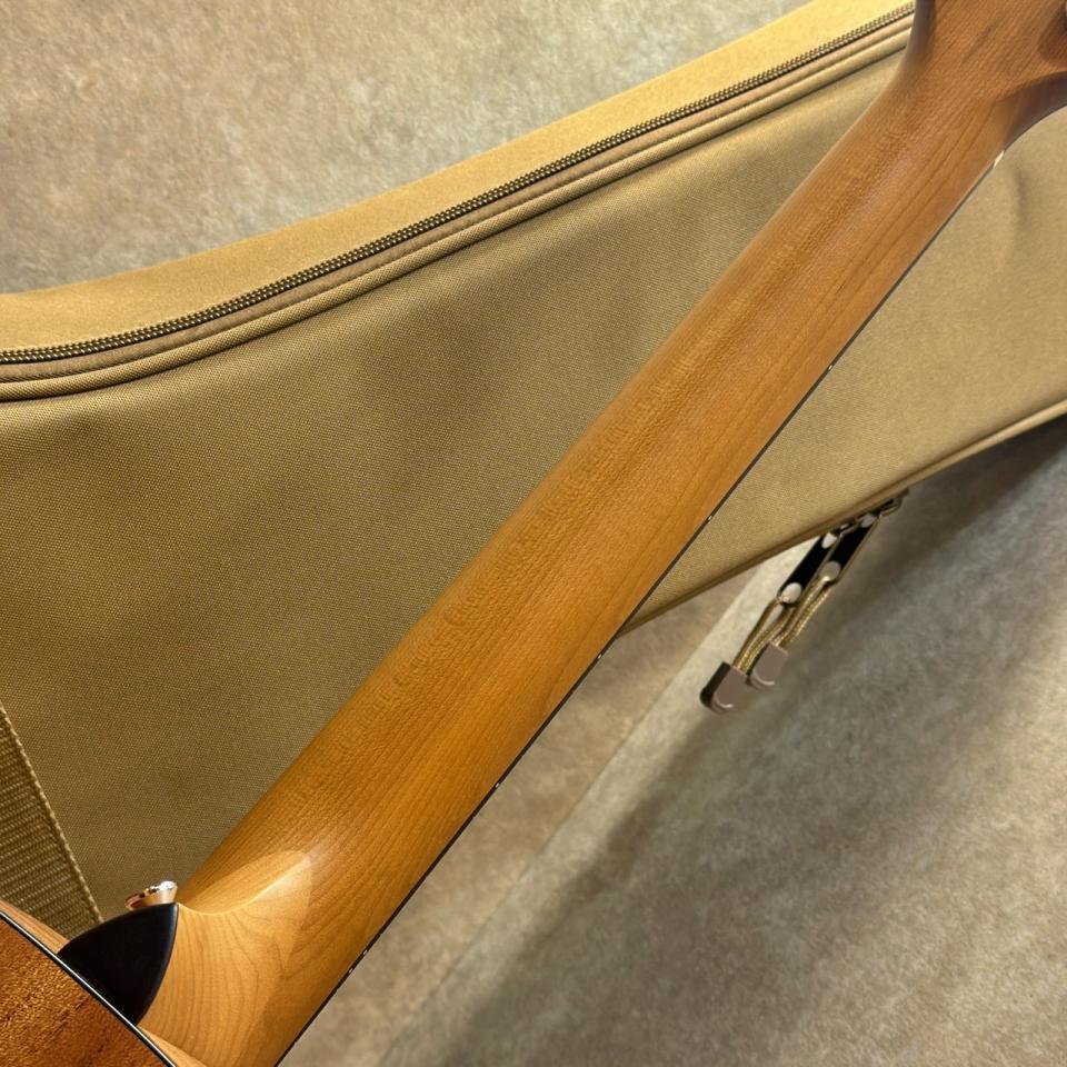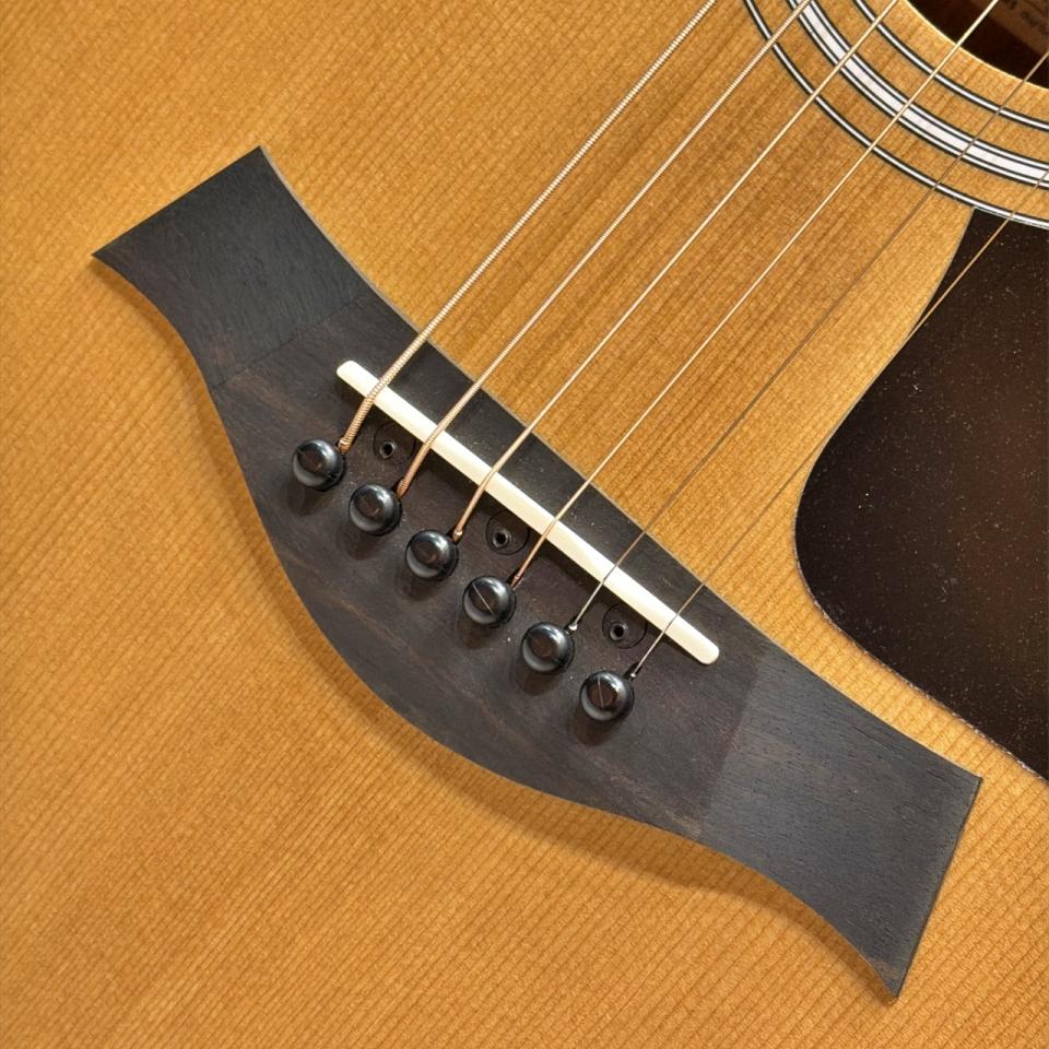 トップには単板トリファイド(ロースト)・スプルースを採用。熱処理により木材内部の水分や樹脂が変化し、弾き込まれたようなレスポンスと、ややドライで甘さを含んだ倍音感を実現しています。