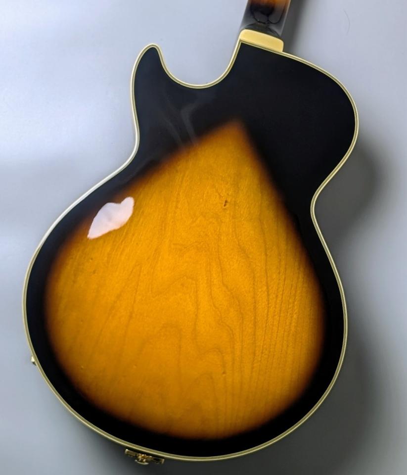 一般的なフルアコ・ギターの数々と比べて小ぶりなボディは抱えやすさからの演奏性も高く、ボディの振動も抑えられるためハウリングにも強い構造となっております。