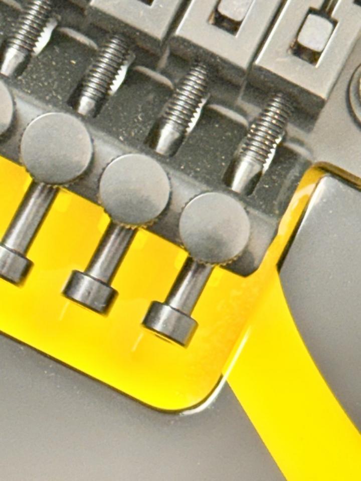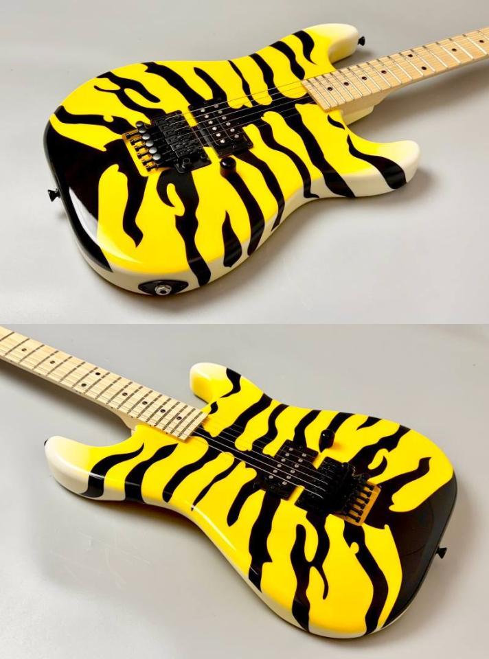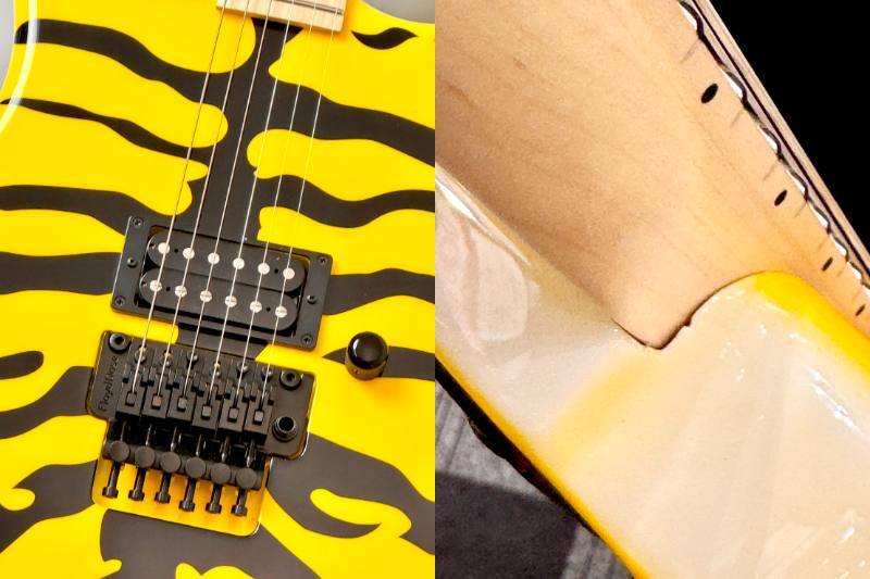 イエロー×ブラックのタイガーストライプが特徴的な一本で、ステージ映えは抜群。視覚的インパクトだけでなく、ハードロック/メタルシーンでの使用を前提とした実戦的なスペックが随所に盛り込まれています。