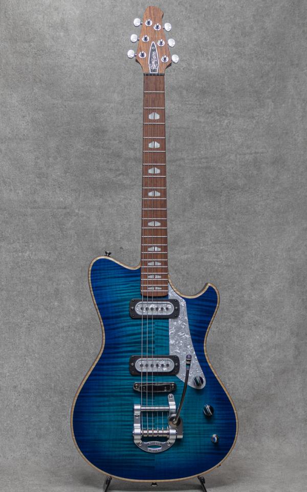海外で話題を集めている新ブランド"Powers Electric”は、”Taylor Guitars”の現CEOも務める”Andy Powers(アンディ・パワーズ)”が創る新ブランド。アンディは7歳の頃に初めて自身でギターを作り、その経験が生涯をかける情熱を生み出し成長させました。2011年に”Bob Taylor(ボブ・テイラー)"より誘いを受けTaylor社へ入社、2022年に同社CEO兼チーフデザイナーに就任し活躍しています。そんなアンディはミュージシャンであり、デザイナーであり、サーファーであり、ビルダーとしてその活躍の場をさらに広げます。故郷カリフォルニア州ノースカウンティで育った彼は、サーフィン、スケートボード、自動車、音楽、アート、デザインといった様々な文化がぶつかり合う環境に大きくインスピレーションされ、”Powers Electric”はそれらをシームレスに融合させ創り上げられています。本器は”A-Type Select Maple / PF42 / Camtail / Blue Lagoon”。大胆なルックス、ダイナミックなサウンド。その全てが新しく、それでいて驚きの完成度を誇る逸品です。フィギュアド杢の浮き出るメイプルトップにホロウ構造を持つアーバンアッシュボディのフルクローズドスリムホロウボディ構造。クラシックカーやホットロッド、そしてサーフボードからインスパイアされたボディ形状は、左右非対称であらゆる角度から視覚的なバランスを損なわない秀逸なアウトライン。美しいシースルーのブルーラグーンにナチュラルバインディングのトップ、サテンブラックのサイド&バックカラー。ワンピースマホガニーネックにホンジュラスローズウッド指板。細めで握り心地の良いネックシェイプで、指板ラジアスは低音弦側と高音弦側で異なるラジアスのスプリットラジアスを採用。高音弦側がわずかにフラットに設計されてチョークフリーなベンドが可能です。ピックアップにはオリジナル”PF42”を搭載、マスターボリューム、マスタートーン、3wayPUセレクター。クールカラーのハードウェアノブ、ホワイトパーロイドピックガード、デルリン製ブリッジサドル、カムテイルビブラート。驚くほどに軽量で、抱えた時の収まりも良く、それでいてボディバランスに長けた本器。クリスピーでアタックの小気味良いリアサウンドから、倍音豊かでレンジ感あるのフロントトーン。トーンバランスがとても良く、しっかりと喰いつくサスティンを併せ持ちます。そして歪ませても音の粒立ちが良く、ポップス・ブルース・ジャズはもちろん、ロック・クラシックロックまで幅広くカバーできるとてもポテンシャルの高いサウンドと演奏性を持ち合わせます。新興ブランドのモダンテイストよりもクラシックかつトラッドなフィールを感じさせながら、扱いやすさやピッチの安定などはとてもモダンなハイブリッドの1本。また付属ケースも拘りが詰め込まれており、60年代ポルシェのシートで使用されていたペピータ柄のレザーケースを作成。ケースの開閉方向も一般的なものとは逆で、開口時に本体を構えた向きと同じ方向から見える様に設計されています。”Powers Electric”は、ペグやPOT・PUスイッチ・ジャックなど以外、PU・サドル・ビブラートやテイルピースの金属ハードウェアやノブパーツに至るまでの全てのパーツからカリフォルニアの自社工場で製作しており、既存の流通パーツや設計の組み合わせで生み出されたギターではありません。アンディがそれまで所有し経験した数多くの名作からインスピレーションを受けながら、未来のプレイヤーのために作り上げた全く新しいギターです。彼の何十年にも渡る研究と努力に基づきゼロから生み出されたニュースタイルのギター。是非、お手元でお確かめください。
