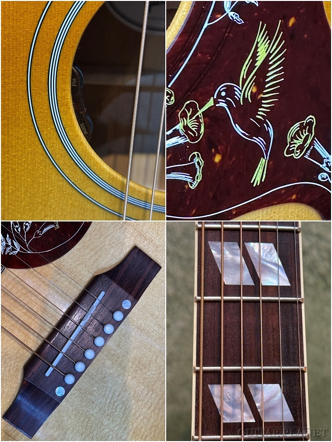 指板バインディングや『マザー・オブ・パール』のクラウン・インレイ、ダブル・パラレログラム・インレイは、ハミングバードがギブソンの上位モデルという証です。
