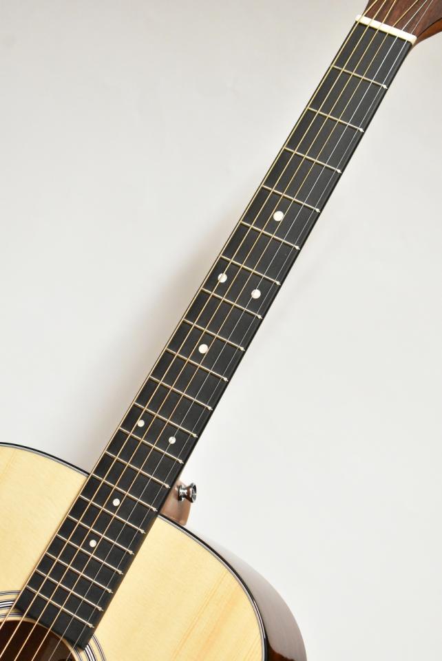 サドルは3~4mmとしっかりと余白があり、ライトゲージ弦で調律、弦高は6弦側で約2.7mm、1弦側で約1.8mmと低めで大変弾きやすい設定です。