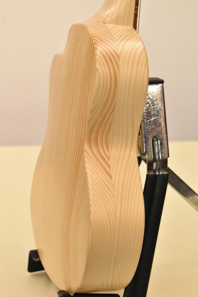 表板を除いた全体を北海道産マツの集積ブロックから削り出して作られています。