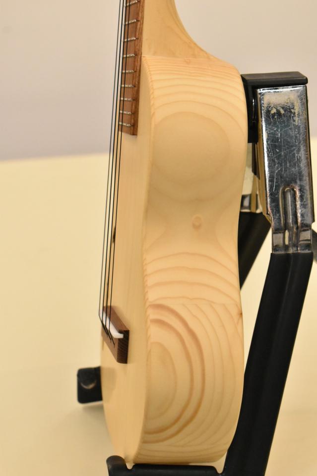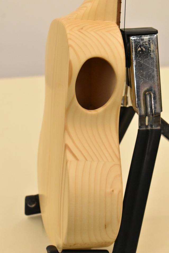 表板を除いた全体を北海道産マツの集積ブロックから削り出して作られています。