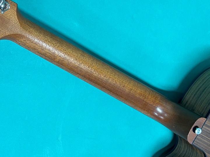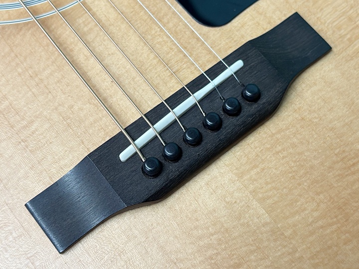 調整も行き届いており、弦高は12フレット上で6弦:2.3mm、1弦:1.9mm、サドルしろは1弦側がやや低めです。フレットの高さもあり、トラスロッドも問題なく機能します。当面はメンテナンスフリーでご使用いただけます。