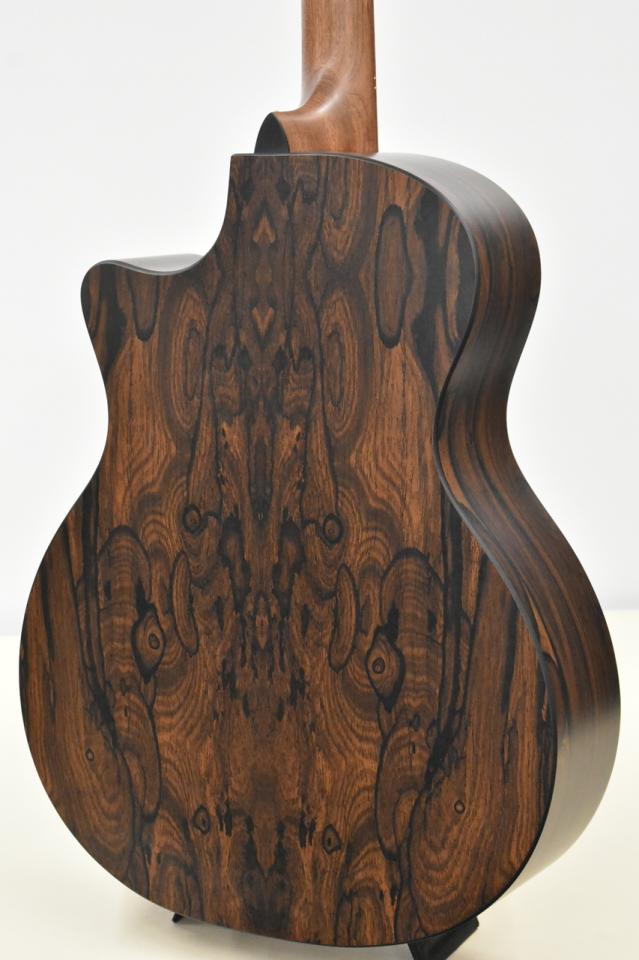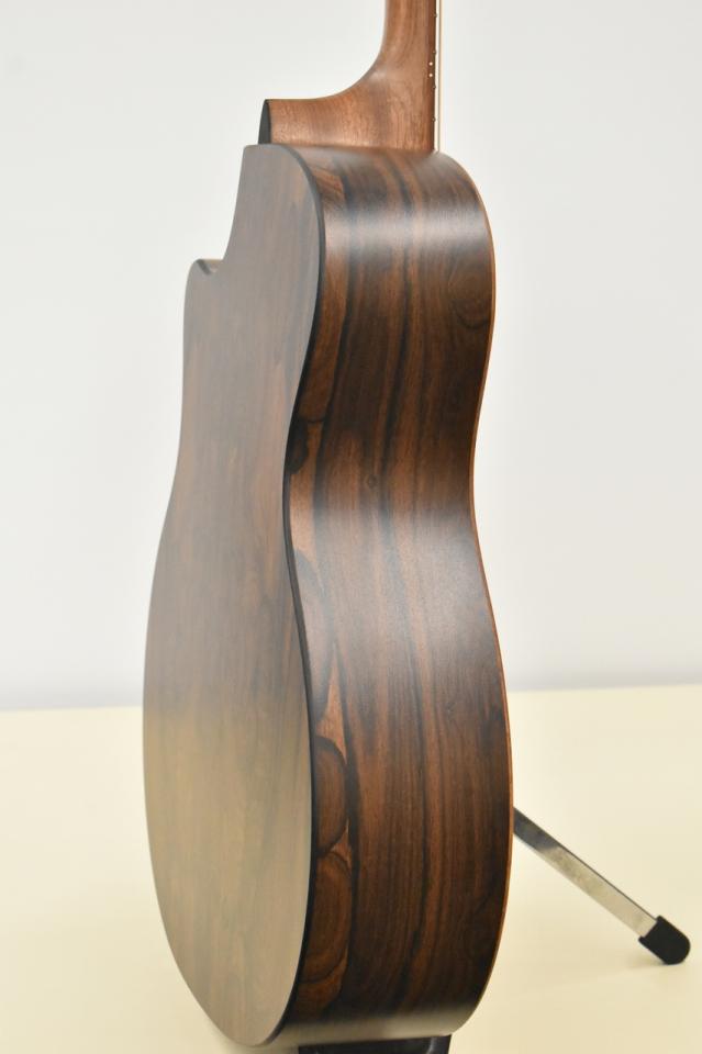 その上からエキゾチックな木目で個性のあるジリコテ材の柄のプリントがなされており、ボディは全体的にサテン仕上げでさらっとした触り心地です。