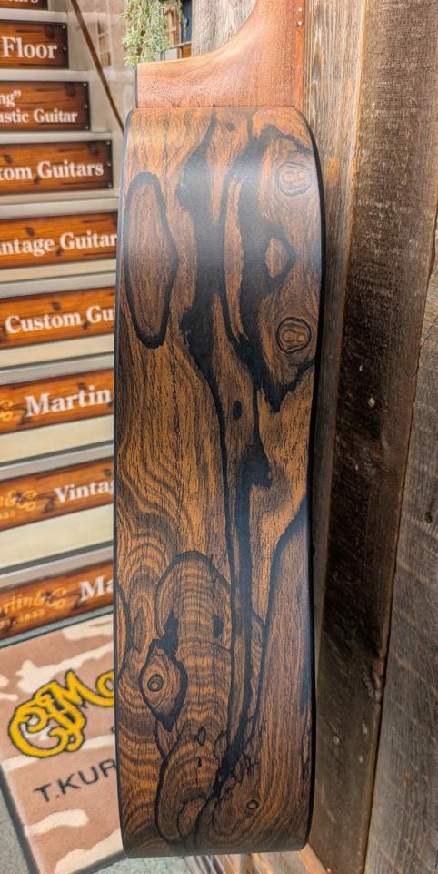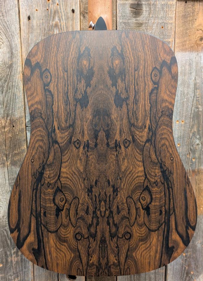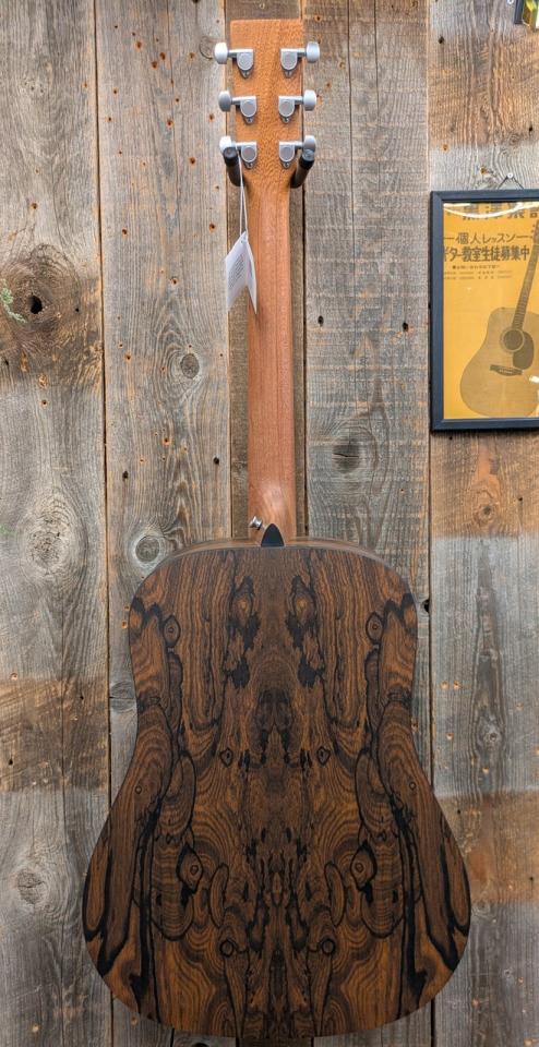 本器はボディトップにスプルース単板、サイド/バックのHPLにジリコテをプリントしたD-X2E Burst。