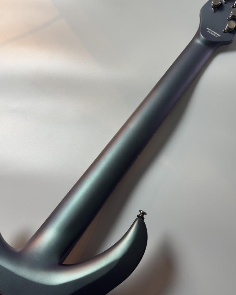 電装系はSterling by Music Man ハムバッキング ピックアップ、アクティブな12dB プッシュ/プッシュ ブーストを搭載。クリーンサウンドは癖がなく全音域がバランスよく鳴る印象です。エフェクティブなサウンドも相性抜群です。